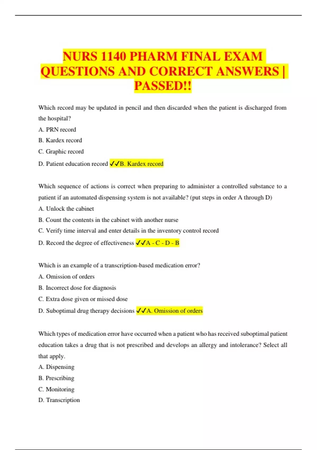 NURS 1140 PHARM FINAL EXAM QUESTIONS AND CORRECT ANSWERS | PASSED!! Which record may be updated in pencil and then discarded when the patient is discharged from the hospital? A. PRN record B. Kardex record C. Graphic record D. Patient education record B. Kardex record Which sequence of actions is correct when preparing to administer a controlled substance to a patient if an automated dispensing system is not available? (put steps in order A through D) A. Unlock the cabinet B. Count the contents in the cabinet with another nurse C. Verify time interval and enter details in the inventory control record D. Record the degree of effectiveness A - C - D - B Which is an example of a transcription-based medication error? A. Omission of orders B. Incorrect dose for diagnosis C. Extra dose given or missed dose D. Suboptimal drug therapy decisions A. Omission of orders Which types of medication error have occurred when a patient who has received suboptimal patient education takes a drug that is not prescribed and develops an allergy and intolerance? Select all that apply. A. Dispensing B. Prescribing C. Monitoring D. Transcription E. Administration B, C