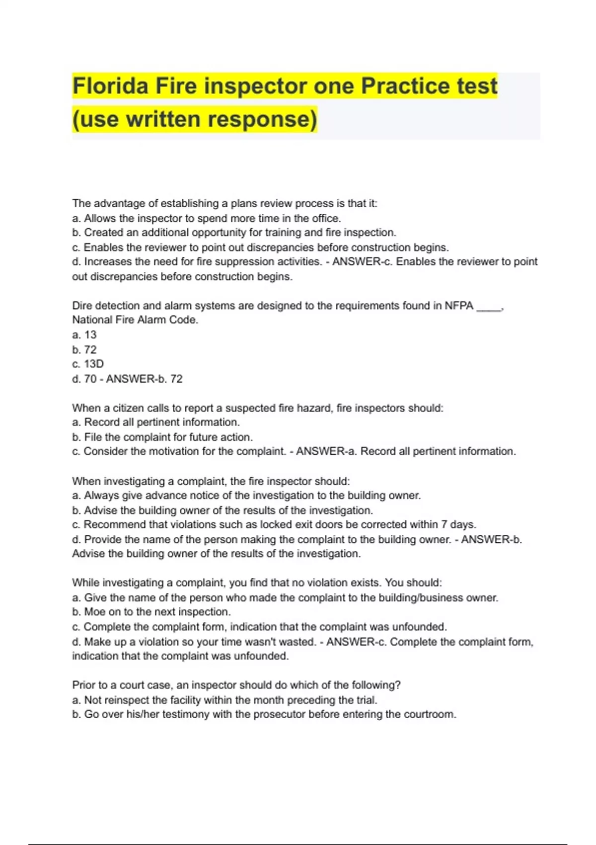 Florida Fire inspector one Practice test (use written response) Florida Fire inspector one Practice test (use written response) 100% Correct The advantage of establishing a plans review process is that it: a. Allows the inspector to spend more time in the office. b. Created an additional opportunity for training and fire inspection. c. Enables the reviewer to point out discrepancies before construction begins. d. Increases the need for fire suppression activities. c. Enables the reviewer to point out discrepancies before construction begins. Dire detection and alarm systems are designed to the requirements found in NFPA ____, National Fire Alarm Code. a. 13 b. 72 c. 13D d. 70 b. 72 When a citizen calls to report a suspected fire hazard, fire inspectors should: a. Record all pertinent information. b. File the complaint for future action. c. Consider the motivation for the complaint. a. Record all pertinent information. When investigating a complaint, the fire inspector should: a. Always give advance notice of the investigation to the building owner. b. Advise the building owner of the results of the investigation. c. Recommend that violations such as locked exit doors be corrected within 7 days. d. Provide the name of the person making the complaint to the building owner. b. Advise the building owner of the results of the investigation. While investigating a complaint, you find that no violation exists. You should: a. Give the name of the person who made the complaint to the building/business owner. b. Moe on to the next inspection. c. Complete the complaint form, indication that the complaint was unfounded. d. Make up a violation so your time wasn't wasted. c. Complete the complaint form, indication that the complaint was unfounded. Prior to a court case, an inspector should do which of the following? a. Not reinspect the facility within the month preceding the trial. b. Go over his/her testimony with the prosecutor before entering the courtroom. c. Appear in your inspection coveralls to convey your professionalism. d. Volunteer information to make responses as detailed and complete as possible. b. Go over his/her testimony with the prosecutor before entering the courtroom. Which of the following is suggested for courtroom procedure or behavior? a. Be argumentative while on the witness stand. b. Make sure that all physical evidence, exhibits, photographs, notes, and reference materials are brought to court. c. Attempt to answer every question, even when you do not know the answer. d. Always give your opinion-you are in court as an expert witness. b. Make sure that all physical evidence, exhibits, photographs, notes, and reference materials are brought to court. Buildings used as a store, market, and other