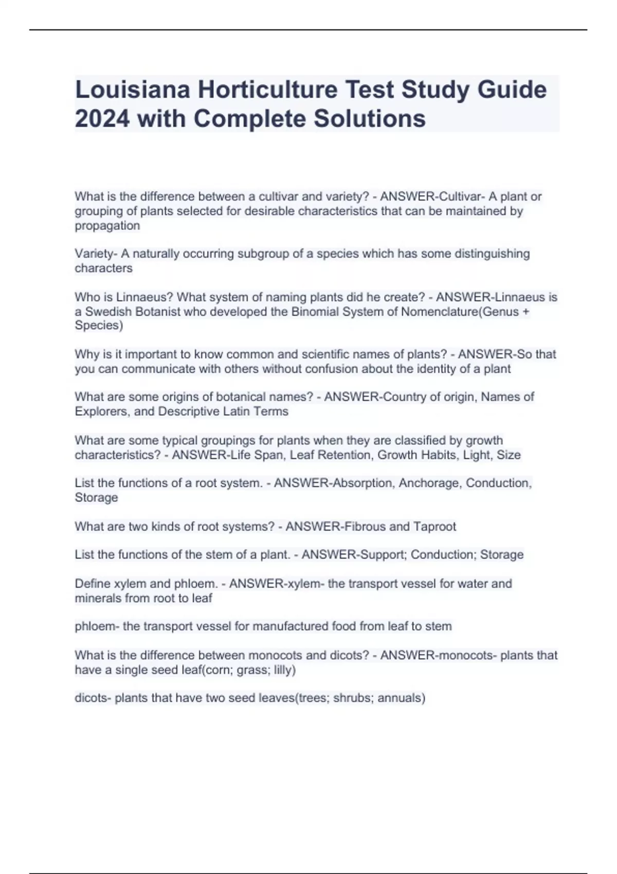 Louisiana Horticulture Test Study Guide 2024 with Complete Solutions Louisiana Horticulture Test Study Guide 2024 with Complete Solutions Louisiana Horticulture Test Study Guide 2024 with Complete Solutions Louisiana Horticulture Test Study Guide 2024 with Complete Solutions What is the difference between a cultivar and variety? - ANSWER-Cultivar- A plant or grouping of plants selected for desirable characteristics that can be maintained by propagation Variety- A naturally occurring subgroup of a species which has some distinguishing characters Who is Linnaeus? What system of naming plants did he create? - ANSWER-Linnaeus is a Swedish Botanist who developed the Binomial System of Nomenclature(Genus + Species) Why is it important to know common and scientific names of plants? - ANSWER-So that you can communicate with others without confusion about the identity of a plant