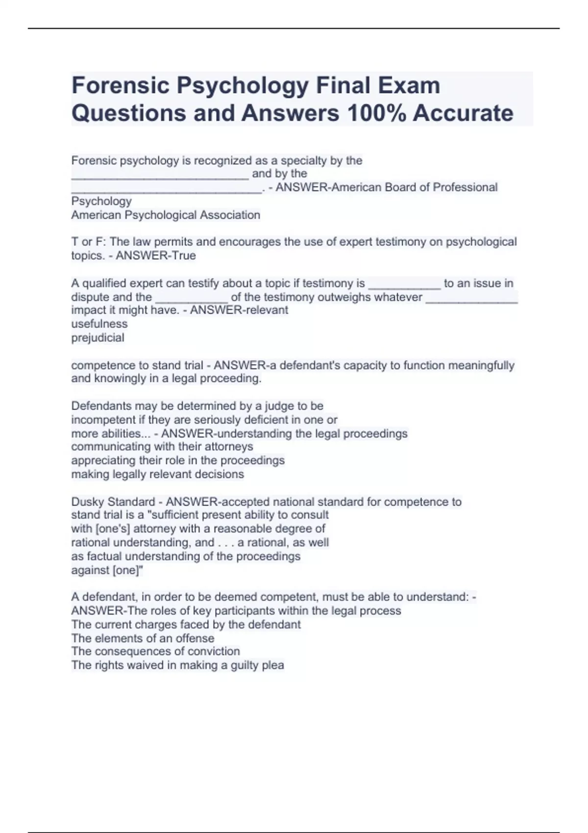 Forensic Psychology Final Exam Questions and Answers 100% AccurateForensic Psychology Final Exam Questions and Answers 100% AccurateForensic Psychology Final Exam Questions and Answers 100% AccurateForensic Psychology Final Exam Questions and Answers 100% Accurate Forensic psychology is recognized as a specialty by the ___________________________ and by the _____________________________. - ANSWER-American Board of Professional Psychology American Psychological Association T or F: The law permits and encourages the use of expert testimony on psychological topics. - ANSWER-True A qualified expert can testify about a topic if testimony is ___________ to an issue in dispute and the ___________ of the testimony outweighs whatever ______________ impact it might have. - ANSWER-relevant usefulness prejudicial competence to stand trial - ANSWER-a defendant's capacity to function meaningfully and knowingly in a legal proceeding.