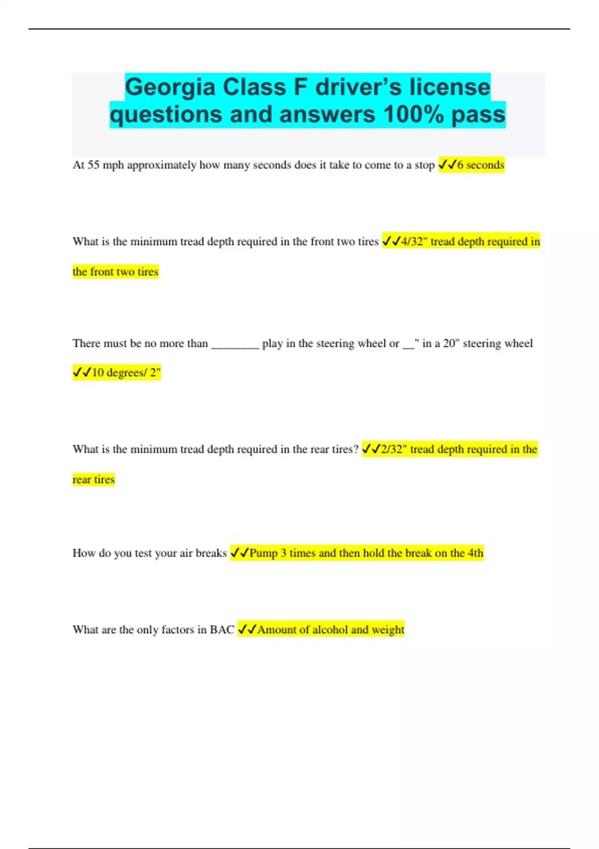 Georgia Class F driver’s license questions and answers 100% pass At 55 mph approximately how many seconds does it take to come to a stop 6 seconds What is the minimum tread depth required in the front two tires 4/32" tread depth required in the front two tires There must be no more than ________ play in the steering wheel or __