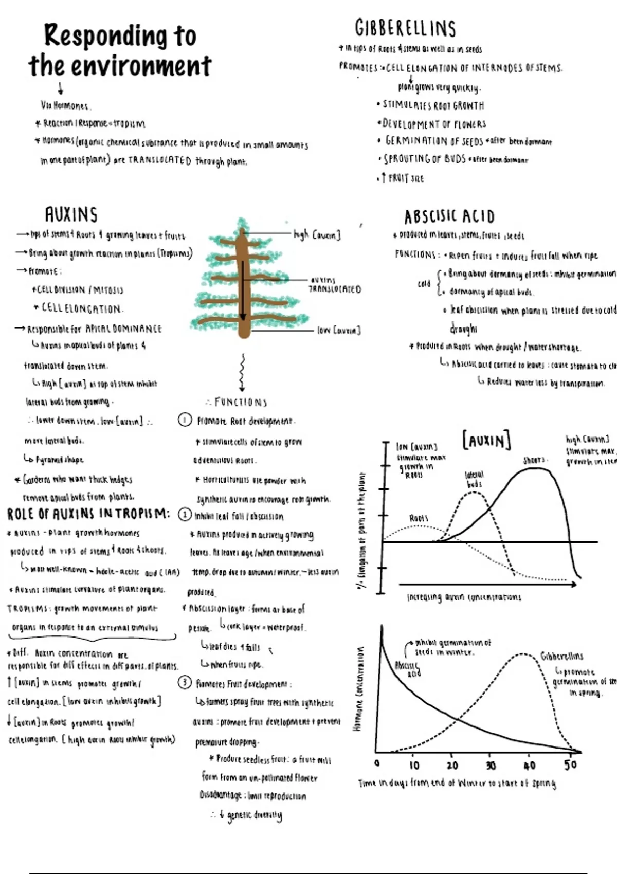 Summary from Life science study guide by E Russell including a great explanation of the function and effect of Auxins , Gibberellins and Abscisic acid in plants as well as the different types of tropisms.