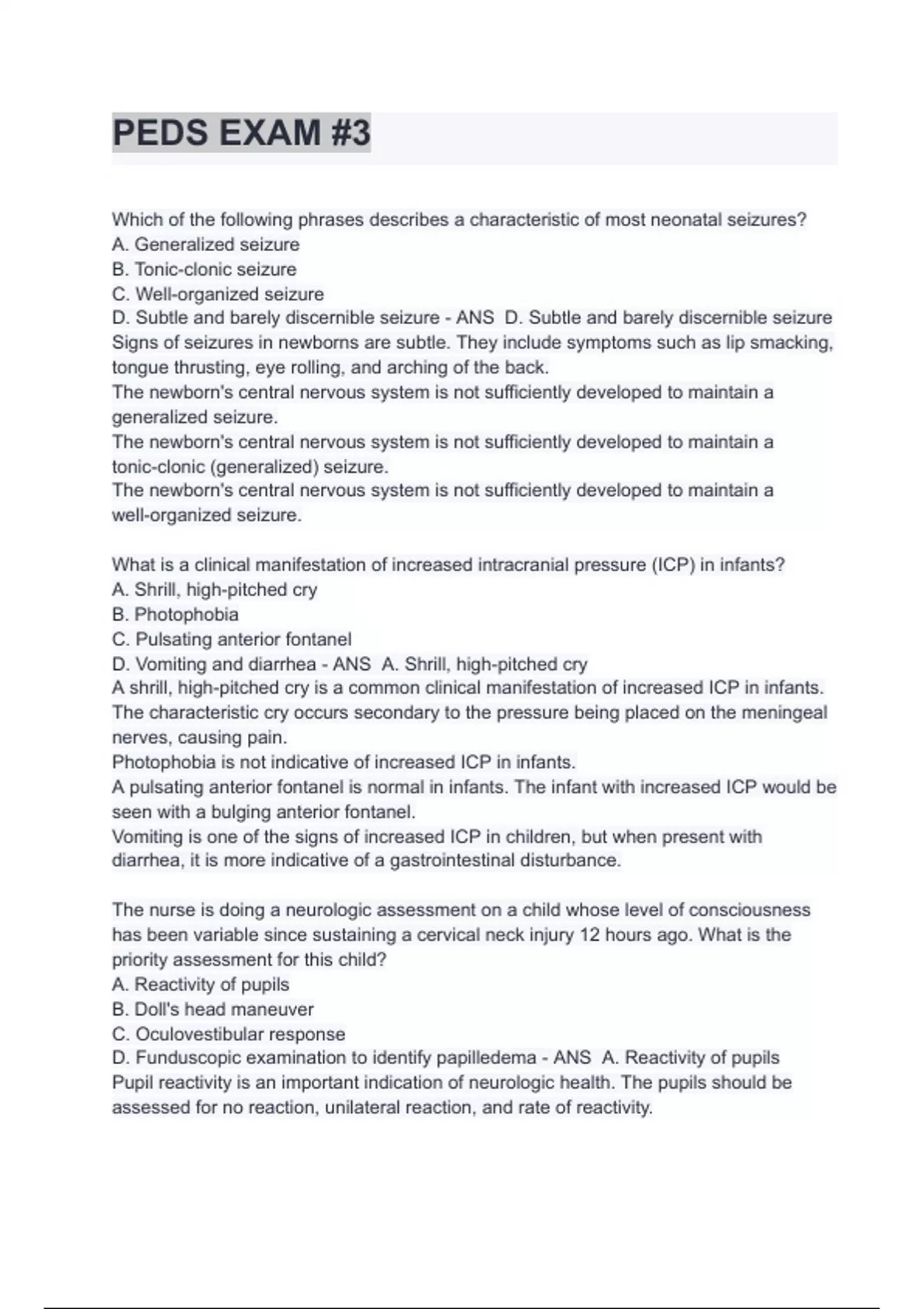 NUR206 UNIT PEDS EXAM 3 Questions And Answers All Verified Which of the following phrases describes a characteristic of most neonatal seizures? A. Generalized seizure B. Tonic-clonic seizure C. Well-organized seizure D. Subtle and barely discernible seizure - ANS D. Subtle and barely discernible seizure Signs of seizures in newborns are subtle. They include symptoms such as lip smacking, tongue thrusting, eye rolling, and arching of the back. The newborn's central nervous system is not sufficiently developed to maintain a generalized seizure. The newborn's central nervous system is not sufficiently developed to maintain a tonic-clonic (generalized) seizure. The newborn's central nervous system is not sufficiently developed to maintain a well-organized seizure. What is a clinical manifestation of increased intracranial pressure (ICP) in infants? A. Shrill, high-pitched cry B. Photophobia C. Pulsating anterior fontanel D. Vomiting and diarrhea - ANS A. Shrill, high-pitched cry A shrill, high-pitched cry is a common clinical manifestation of increased ICP in infants. The characteristic cry occurs secondary to the pressure being placed on the meningeal nerves, causing pain. Photophobia is not indicative of increased ICP in infants. A pulsating anterior fontanel is normal in infants. The infant with increased ICP would be seen with a bulging anterior fontanel. Vomiting is one of the signs of increased ICP in children, but when present with diarrhea, it is more indicative of a gastrointestinal disturbance