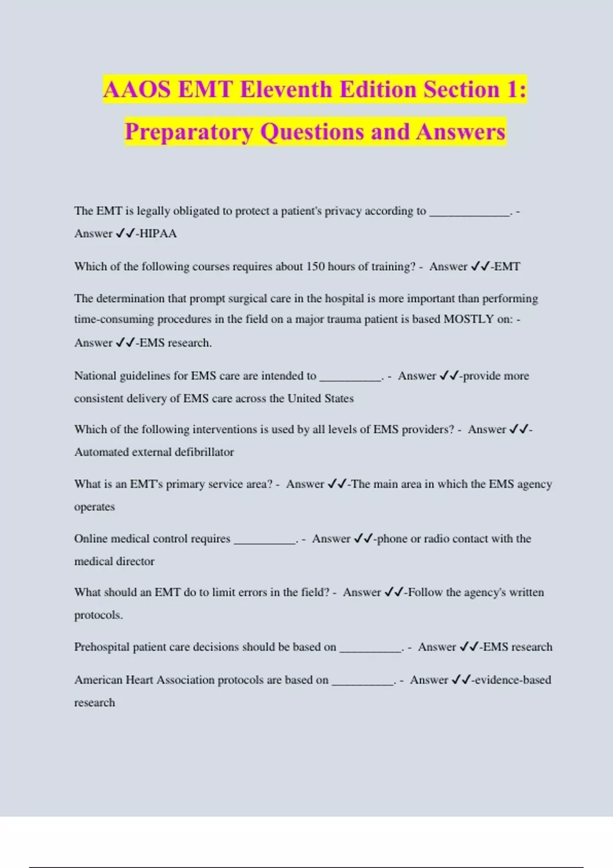 AAOS EMT Eleventh Edition Section 1: Preparatory Questions and Answers