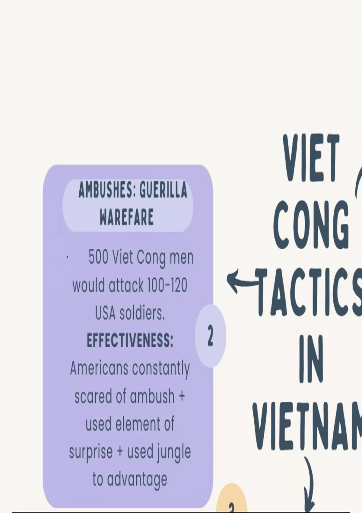 This mindmap has the three main tactics that the Viet Cong fighters used to successfully defeat USA soldiers. It is really important to study these small topics as the IEB often asks you to compare the two different tactics of the opposing fighters.