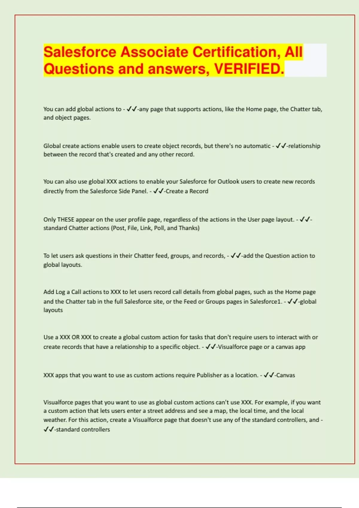 Salesforce Associate Certification, All Questions and answers, VERIFIED. You can add global actions to - -any page that supports actions, like the Home page, the Chatter tab, and object pages. Global create actions enable users to create object records, but there's no automatic - -relationship between the record that's created and any other record. You can also use global XXX actions to enable your Salesforce for Outlook users to create new records directly from the Salesforce Side Panel. - -Create a Record Only THESE appear on the user profile page, regardless of the actions in the User page layout. - - standard Chatter actions (Post, File, Link, Poll, and Thanks) To let users ask questions in their Chatter feed, groups, and records, - -add the Question action to global layouts. Add Log a Call actions to XXX to let users record call details from global pages, such as the Home page and the Chatter tab in the full Salesforce site, or the Feed or Groups pages in Salesforce1. - -global layouts Use a XXX OR XXX to create a global custom action for tasks that don't require users to interact with or create records that have a relationship to a specific object. - -Visualforce page or a canvas app XXX apps that you want to use as custom actions require Publisher as a location. - -Canvas Visualforce pages that you want to use as global custom actions can't use XXX. For example, if you want a custom action that lets users enter a street address and see a map, the local time, and the local weather. For this action, create a Visualforce page that doesn't use any of the standard controllers, and - -standard controllers add it as a custom global action. KanBan View - -can be set to show a graphical view of records in a list view. This view organizes a set of records into columns to track work at a quick glance. Table View - -This view is the default display option for Salesforce list views Split View - -This view displays Salesforce information with the list on the left and the record detail on the right. Tab - -The starting point for viewing, editing, and entering information for a particular object. Recycle Bin - -View and restore records Object Manager - -A tool that lets admins access object management settings to view and customize standard and custom objects in your org. Related List - -A section of a record or other detail page that lists items related to that record. For example, the Stage History related list of an opportunity or the Open Activities related list of a case. This list includes details and links related to other records. Formula Field - -An algorithm that derives its value from other fields, expressions, or values. This can automatically calculate the value of a field based on other fields. Number field - -A field that stores only numeric values. Dynamic Forms - -Dynamic forms allow you to display fields and sections on a page layout individually like a component so that users only get what they need to see. Roll-up Summary Field - -- A custom object field that calculates values from related records or the records in a related list. -Created to display a value in a master record based on the values of fields in a detail record. This field type can be defined on Master-Detail relationship only Page layouts - -This controls the layout and organization of buttons, fields, and related lists on object record pages. customize the fields that will be displayed on the page. Admins use this to customize the content of record pages for users. Useful for different record types when they each require different fields. Apex Code - -Is a strongly typed, object-oriented programming language that allows developers to execute flow and transaction control statements in the Lightening platform server in conjunction with calls to the Lightening platform API. Salesforce Path - -You use this to guide users through steps in a business process Dependent Picklist - -Users use this picklist to filter values for one picklist, based on a selection from another picklist or a checkbox (the controlling value) on the same record. Default values - -An admin controls these values on the picklist in Setup mode. Schema Builder - -Can be used to view the data model as well as create objects, fields, and relationships quickly. A tool that lets you visualize and edit your data model. It's a handy tool for introducing your Salesforce customizations to a co-worker or explaining the way data flows throughout your system. You can create relationship fields, formula fields, and normal fields in this tool. Object Relationships - -- Master-detail - Many-to-many - Lookup Record Types - -Used for different business processes, picklist values, and page layouts for different users based on profile. All of these are stored as data fields in the org's database. When you update or create one, the search engine comes along, makes a copy of the data, and breaks up the content into smaller pieces called tokens. We store these tokens in the search index, along with a link back to the original ___________. 1. Subcategory of objects. 2. Allows you to offer users different page layouts and picklist values for different business scenarios, based on their profiles. 3. Allows you to funnel into appropriate workflows/queues. Field Types - -Examples of this in Salesforce are: - Formula - Checkbox - Date A salesforce report can include 5 custom formula fields. This limit is hard-coded and cannot be increased. - -How many custom formula fields can a Salesforce report include? Report folders - -Reports are stored in these. You can share reports with users, groups, roles, and territories using these. If you export a report, it would REMOVE the security of the platform. Report builder shows a MAXIMUM of 20 rows for summary reports (grouped by rows) and matrix reports (grouped by columns) and 50 rows for tabular reports (no groupings). - -How many rows does Report Builder show for the following: 1) Summary reports 2) Matrix reports 3) Tabular repor