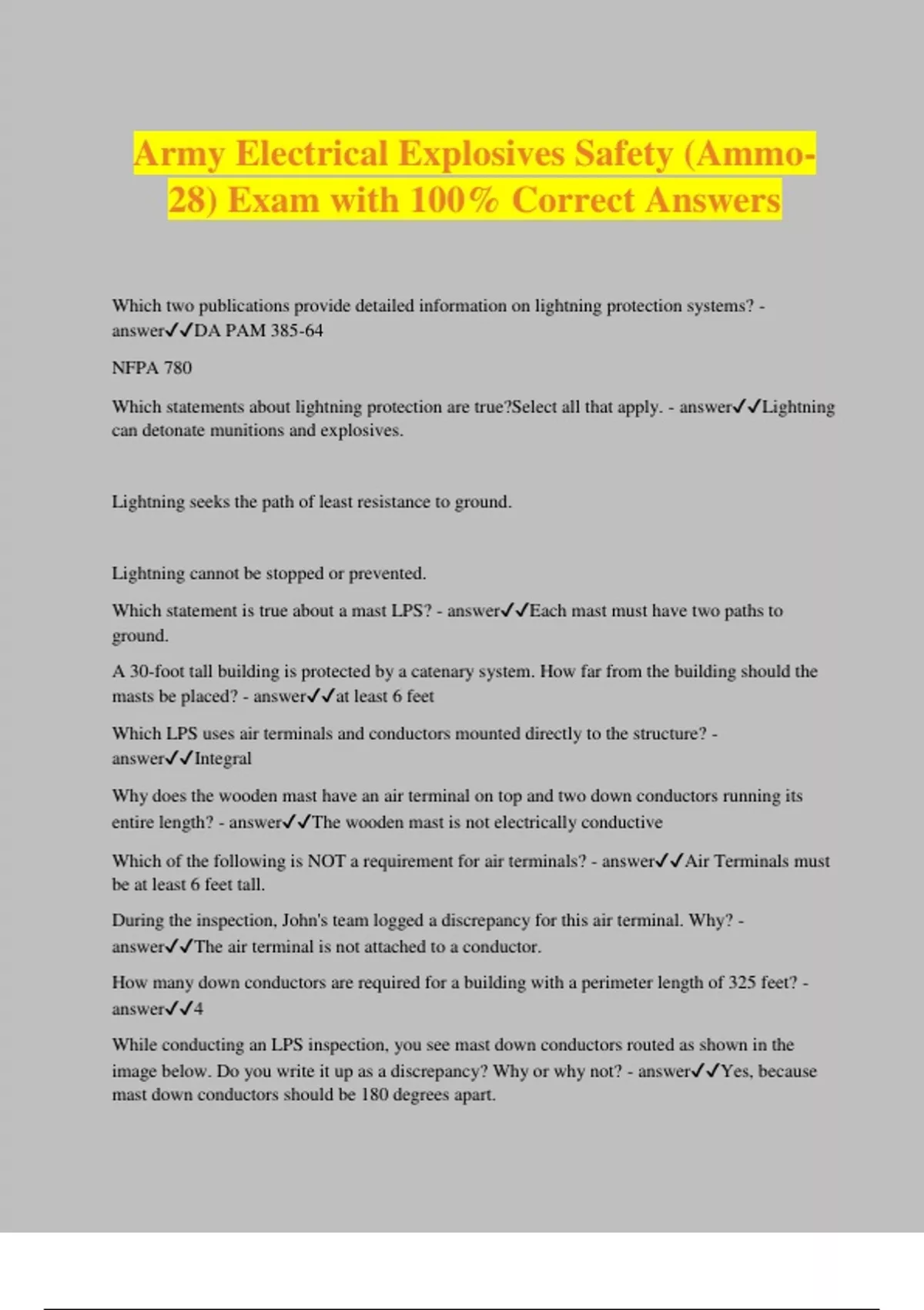 Army Electrical Explosives Safety (Ammo- 28) Exam with 100% Correct Answers Which two publications provide detailed information on lightning protection systems? - answerDA PAM 385-64 NFPA 780 Which statements about lightning protection are true?Select all that apply. - answerLightning can detonate munitions and explosives. Lightning seeks the path of least resistance to ground. Lightning cannot be stopped or prevented. Which statement is true about a mast LPS? - answerEach mast must have two paths to ground. A 30-foot tall building is protected by a catenary system. How far from the building should the masts be placed? - answerat least 6 feet Which LPS uses air terminals and conductors mounted directly to the structure? - answerIntegral Why does the wooden mast have an air terminal on top and two down conductors running its entire length? - answerThe wooden mast is not electrically conductive Which of the following is NOT a requirement for air terminals? - answerAir Terminals must be at least 6 feet tall. During the inspection, John's team logged a discrepancy for this air terminal. Why? - answerThe air terminal is not attached to a conductor. How many down conductors are required for a building with a perimeter length of 325 feet? - answer4 While conducting an LPS inspection, you see mast down conductors routed as shown in the image below. Do you write it up as a discrepancy? Why or why not? - answerYes, because mast down conductors should be 180 degrees apart. A steel beam, connected to the main LPS at its upper and lower extremities, is used as a down conductor. At what intervals should it be connected to the grounding system? - answer60 feet or less Which statement about grounding systems is true? - answerThe resistance should be 25 ohms or less. Which of the following statements regarding bonding are true? Select all that apply. - answerBonding reduces the threat of sideflash by providing a low impedance path to ground. Bonding is a way of connecting LPS conductors to grounded metal objects. When should a grounded metal object be considered for bonding? - answerWhen it's within 6 feet of a conductor Which bonding method is the most permanent and secure? - answerExothermic weld Which factors are used to calculate bonding distance?Select all that apply. - answerHeight of proposed bond Flashover medium Number of down conductors While conducting the inspection, John's team noticed a new metal light pole installed 3 feet from the down conductor at the corner of this building. They logged a discrepancy. Why? - answerBecause grounded metal obj