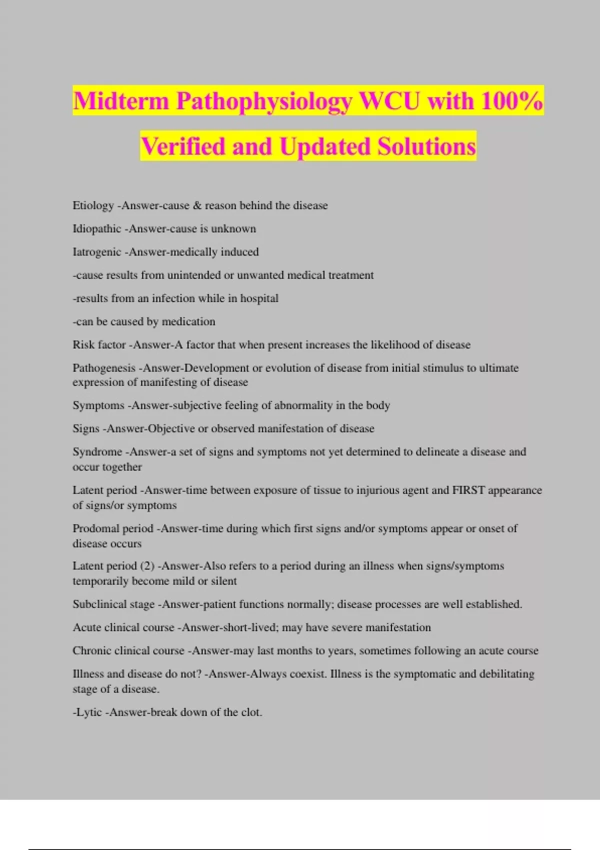 Midterm Pathophysiology WCU with 100% Verified and Updated Solutions Etiology -Answer-cause & reason behind the disease Idiopathic -Answer-cause is unknown Iatrogenic -Answer-medically induced -cause results from unintended or unwanted medical treatment -results from an infection while in hospital -can be caused by medication Risk factor -Answer-A factor that when present increases the likelihood of disease Pathogenesis -Answer-Development or evolution of disease from initial stimulus to ultimate expression of manifesting of disease Symptoms -Answer-subjective feeling of abnormality in the body Signs -Answer-Objective or observed manifestation of disease Syndrome -Answer-a set of signs and symptoms not yet determined to delineate a disease and occur together Latent period -Answer-time between exposure of tissue to injurious agent and FIRST appearance of signs/or symptoms Prodomal period -Answer-time during which first signs and/or symptoms appear or onset of disease occurs Latent period (2) -Answer-Also refers to a period during an illness when signs/symptoms temporarily become mild or silent Subclinical stage -Answer-patient functions normally; disease processes are well established. Acute clinical course -Answer-short-lived; may have severe manifestation Chronic clinical course -Answer-may last months to years, sometimes following an acute course Illness and disease do not? -Answer-Always coexist. Illness is the symptomatic and debilitating stage of a disease. -Lytic -Answer-break down of the clot. Syphilis -Answer-Can occur between latent & prodromal period and between prodromal and latent period. Remission -Answer-decrease in severity, signs, or symptoms; may indicate disease is cured. Exacerbation -Answer-increase in severity,signs, or symptoms Sequela -Answer-Subsequent pathologic condition resulting from an acute illness. EX: placing a cast on someone then removing it and results in joint stiffness Statistical normality -Answer-estimate of diseases in a normal population, based on bell shape curve Reliability -Answer-Test's ability to give the same results in repeated measurements Validity -Answer-degree to which a measurement reflects the true value of what it intends to measure Predictive value -Answer--Extent to which a test can differentiate between presence or absence of a persons condition. -A test. Sensitivity -Answer-probability that a test will be positive when applied to a person with a particular condition. -A true positive Specificity -Answer-Probability that a test will be negative when applied to a person without a particular condition -A true negative Gender differences -Answer-relevant in both in health and disease EX: hemoglobin, sex & growth hormones Situational differences -Answer-determine whether a derivation from normal should be considered abnormal or an adaptation mechanism. EX: RBC's count increases when a person moves to a high altitude. Time variations -Answer-may impact how the body responds from day to night or at varying times. EX: hormones & body temp are higher in the AM Growth hormones released while sleeping Epidemiology -Answer-study of the patterns of disease involving populations Endemic disease -Answer-native to a local region Epidemic disease -Answer-Spread to many people at the same time EX: SARS Pandemic disease -Answer-spread to large geographic results Factors affecting patterns of disease -Answer--Age -Ethnic group -Gender -Socioeconomic factors/lifestyle considerations -Geographic location Primary Prevention -Answer-altering susceptibility, reducing exposure for susceptible persons EX: public places, saying no to drugs & abstinence from sex Secondary -Answer-early detection, screening