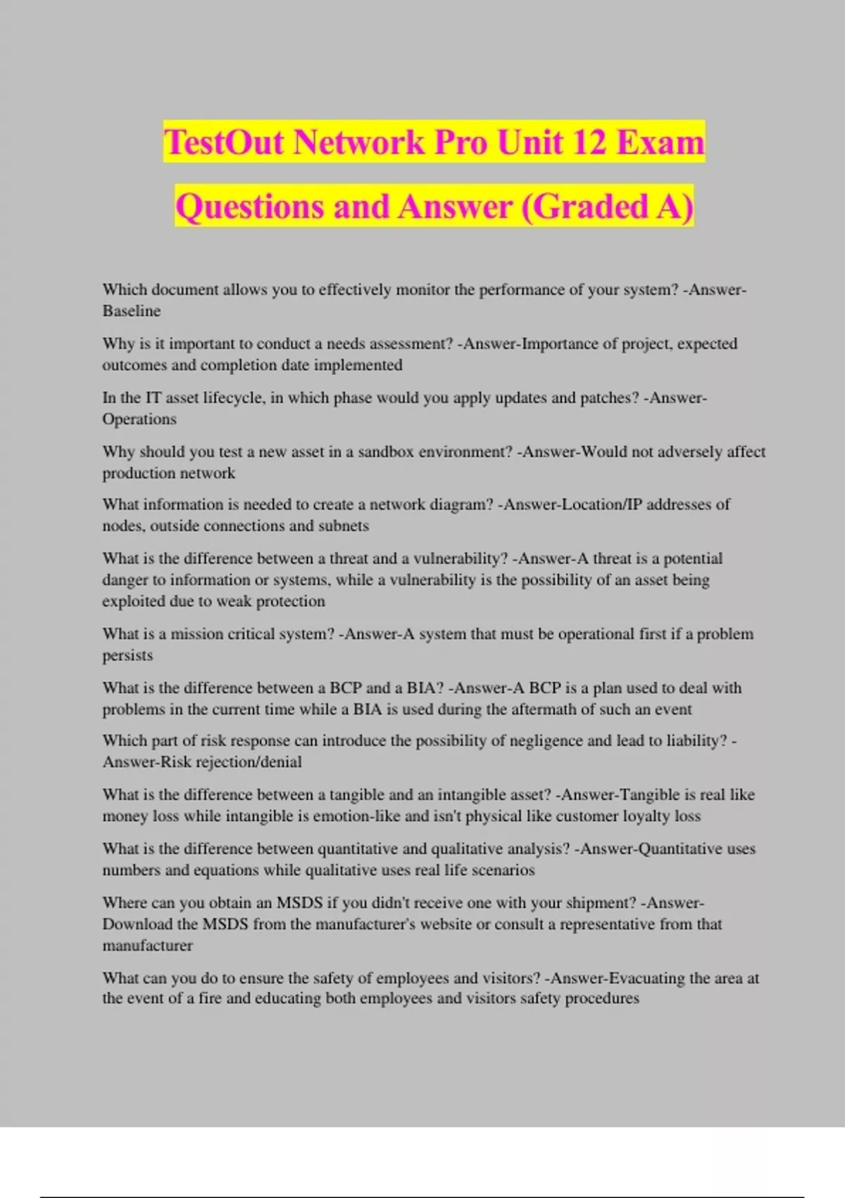 TestOut Network Pro Unit 12 Exam Questions and Answer (Graded A) Which document allows you to effectively monitor the performance of your system? -Answer- Baseline Why is it important to conduct a needs assessment? -Answer-Importance of project, expected outcomes and completion date implemented In the IT asset lifecycle, in which phase would you apply updates and patches? -Answer- Operations Why should you test a new asset in a sandbox environment? -Answer-Would not adversely affect production network What information is needed to create a network diagram? -Answer-Location/IP addresses of nodes, outside connections and subnets What is the difference between a threat and a vulnerability? -Answer-A threat is a potential danger to information or systems, while a vulnerability is the possibility of an asset being exploited due to weak protection What is a mission critical system? -Answer-A system that must be operational first if a problem persists What is the difference between a BCP and a BIA? -Answer-A BCP is a plan used to deal with problems in the current time while a BIA is used during the aftermath of such an event Which part of risk response can introduce the possibility of negligence and lead to liability? - Answer-Risk rejection/denial What is the difference between a tangible and an intangible asset? -Answer-Tangible is real like money loss while intangible is emotion-like and isn't physical like customer loyalty loss What is the difference between quantitative and qualitative analysis? -Answer-Quantitative uses numbers and equations while qualitative uses real life scenarios Where can you obtain an MSDS if you didn't receive one with your shipment? -Answer- Download the MSDS from the manufacturer's website or consult a representative from that manufacturer What can you do to ensure the safety of employees and visitors? -Answer-Evacuating the area at the event of a fire and educating both employees and visitors safety procedures