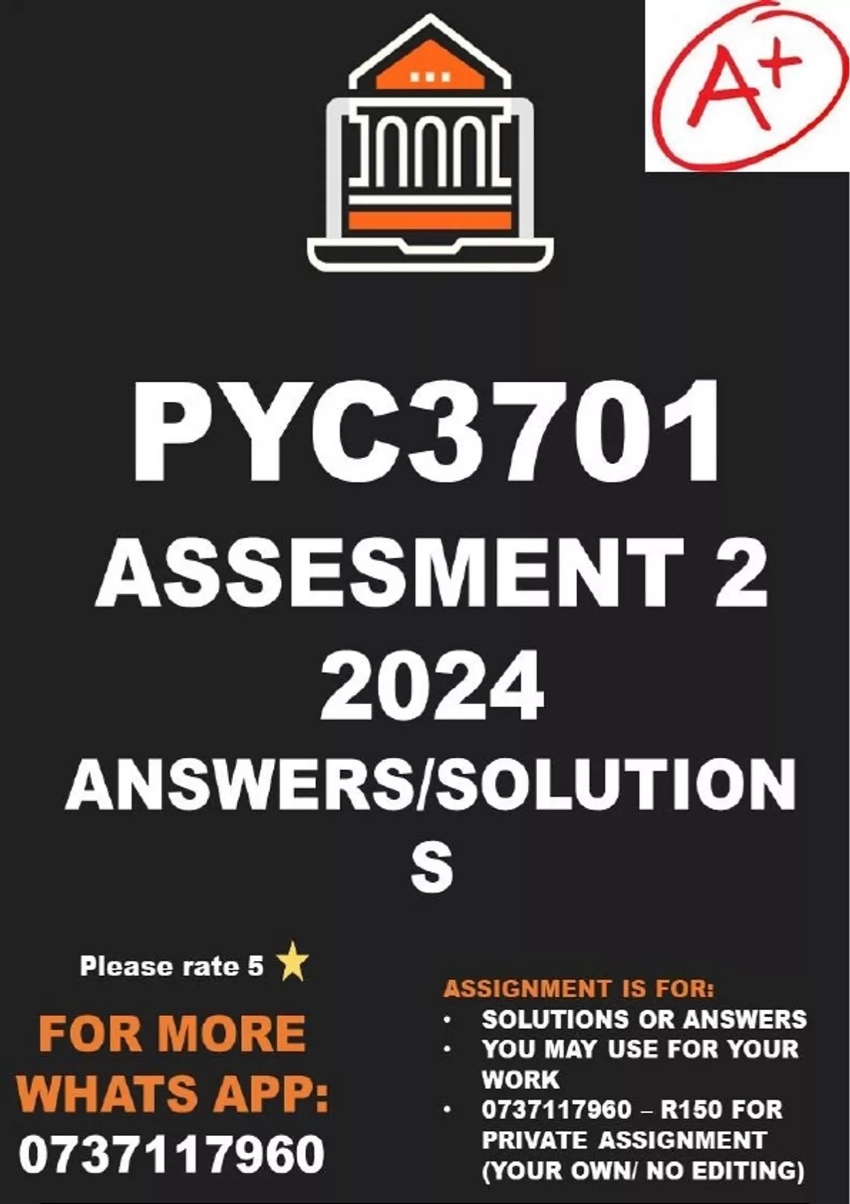 PYC2601 Assignment 2 2024 (Solutions) Question 1 Not yet answered Marked out of 1.00 Flag question Question text According to balance theory, non-balance exists when - - - - - a. two people dislike one another b. two people discover they are dissimilar in some way but neither like nor dislike each other. c. one person likes the other and the other person dislikes the first. d. one person likes the other and the other person dislikes the first. Question 2 Not yet answered Marked out of 1.00 Flag question Question text Angela and Becky are good friends. Carol greatly dislikes Angela but is not acquainted with Becky. Given this information, if Carol sees Angela and Becky interacting, Carol is MOST likely to react to Becky - - - - - a. by having a positive reaction to her. b. by having a negative reaction to her. c. in an indifferent fashion since she is not acquainted with her. d. by trying to develop a friendship with her in order to anger Angela. Question 3 Not yet answered Marked out of 1.00 Flag question Question text Thomas is beginning his first year of college. Since one of his goals is to meet people and make new friends in his classes, Thomas would be well-advised to - - - - - a. spend as much time as possible interacting with the instructor. b. sit between other students in his classes whenever possible. c. sit in the back of the room so he can take notes quietly during class. d. sit at the front of the room and on the end of a row. Question 4 Not yet answered Marked out of 1.00 Flag question Question text Research shows that attractive defendants are - - - - - a. more likely to be found guilty than unattractive defendants. b. more likely to be found guilty than unattractive defendants. c. more likely to be offered a plea bargain. d. less likely to be found guilty than unattractive defendants. Question 5 Not yet answered Marked out of 1.00 Flag question Question text The proportion of similarity is predictive of the degree of attraction between two people - - - - - a. when discussions are between females and females. b. when discussions are between males and females. c. regardless of the importance of the topics they discuss. d. when discussions are of topics that are important to the individuals. Question 6 Not yet answered Marked out of 1.00 Flag question Question text Who proposed the configural and algebraic models of social cognition? a. Solomon Asch b. Kurt Lewin c. Immanuel Kant d. A and B Question 7 Not yet answered Marked out of 1.00 Flag question Question text Pressures toward conformity have a stronger effect on our behaviour when - - - - - a. we like and admire a particular group of persons. b. the group we observe is very small. c. different members of a particular group are saying or doing different things. d. we observe a particular group of persons engaging in irrational behaviour. Question 8 Not yet answered Marked out of 1.00 Flag question Question text Ada had missed the notes for several classes and asked Rob for the notes for one day. Rob gave the notes to Ada, who copied them and then asked Rob for a week’s worth of notes. Because of the - - - - - Rob is highly likely to give Ada the notes. a. foot-in-the-door technique b. two stage compliance approach c. lowball technique d. door-in-the-face technique Question 9 Not yet answered Marked out of 1.00 Flag question Question text The empathic joy hypothesis suggests we - - - - - a. help others because of genetic attributes that evolved in response to natural selection pressures. b. help others because of the positive emotions we anticipate experiencing as a result of our helping behaviours. c. help others because we expect to be helped by them or someone similar at some time in the f future. d. help others solely because we want to help someone in need. Question 10 Not yet answered Marked out of 1.00 Flag question Question text Mark and Cynthia are writing out checks to donate to their alma mater. First, Mark says he’s going to donate R5 000, 00 and then Cynthia indicates she might be able to donate more than that. Mark then decides he too could contribute more than R5 000,00. What is this called? a. Negative-state relief b. Empathy-altruism c. Altruism d. Competitive altruism Question 11 Not yet answered Marked out of 1.00 Flag question Question text Karen knows that her neighbors often struggle to make ends meet. She sometimes offers to babysit for free because she can easily afford to do so and feels good that she can help in this small way. This example most clearly illustrates the........... a. empathic joy hypothesis. b. negative state relief model. c. empathy-altruism model. d. defensive helping. Question 12 Not yet answered Marked out of 1.00 Flag question Question text Leeto is alone, resting on a beach when he notices someone who appears to be floundering in the ocean. Since he does not know how to swim, Leeto, realizes that he cannot help this individual himself. This example illustrates that people ……….. a. often fail to recognize the emergency in such situations. b. usually want to be left alone and not deal with others' predicaments. c. often do not help others when they are alone. d. often decide that they cannot help when they do not know what to do. Question 13 Not yet answered Marked out of 1.00 Flag question Question text When we thank someone for helping us, they are more likely to help us again. This is because gratitude......... a. increases their self-efficacy. b. increases their self-worth. c. decreases their self-efficacy. d. decreases their self-esteem. Question 14 Not yet answered Marked out of 1.00 Flag question Question text A Johannesburg Uber driver once intervened and stopped what he perceived to be a mugging in progress- even though it actually was a group of actors performing a scene for a television scene. The Uber driver probably intervened due to……. a. pure stupidity b. the absence of the bystander effect c. the fact that he is a Jo' burger. d. his feelings of em