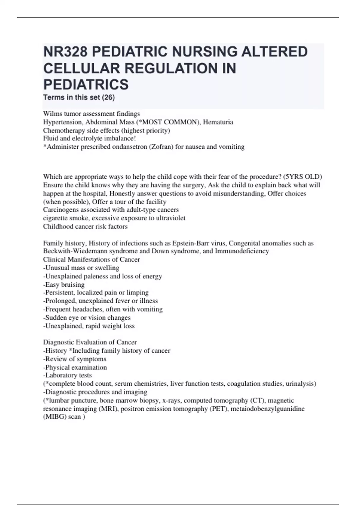 NR328 PEDIATRIC NURSING ALTERED CELLULAR REGULATION IN PEDIATRICS Terms in this set (26) Wilms tumor assessment findings Hypertension, Abdominal Mass (*MOST COMMON), Hematuria Chemotherapy side effects (highest priority) Fluid and electrolyte imbalance! *Administer prescribed ondansetron (Zofran) for nausea and vomiting Brainpower Read More Which are appropriate ways to help the child cope with their fear of the procedure? (5YRS OLD) Ensure the child knows why they are having the surgery, Ask the child to explain back what will happen at the hospital, Honestly answer questions to avoid misunderstanding, Offer choices (when possible), Offer a tour of the facility Carcinogens associated with adult-type cancers cigarette smoke, excessive exposure to ultraviolet Childhood cancer risk factors Family history, History of infections such as Epstein-Barr virus, Congenital anomalies such as Beckwith-Wiedemann syndrome and Down syndrome, and Immunodeficiency Clinical Manifestations of Cancer -Unusual mass or swelling -Unexplained paleness and loss of energy -Easy bruising -Persistent, localized pain or limping -Prolonged, unexplained fever or illness -Frequent headaches, often with vomiting -Sudden eye or vision changes -Unexplained, rapid weight loss Diagnostic Evaluation of Cancer -History *Including family history of cancer -Review of symptoms -Physical examination -Laboratory tests (*complete blood count, serum chemistries, liver function tests, coagulation studies, urinalysis) -Diagnostic procedures and imaging (*lumbar puncture, bone marrow biopsy, x-rays, computed tomography (CT), magnetic resonance imaging (MRI), positron emission tomography (PET), metaiodobenzylguanidine (MIBG) scan )