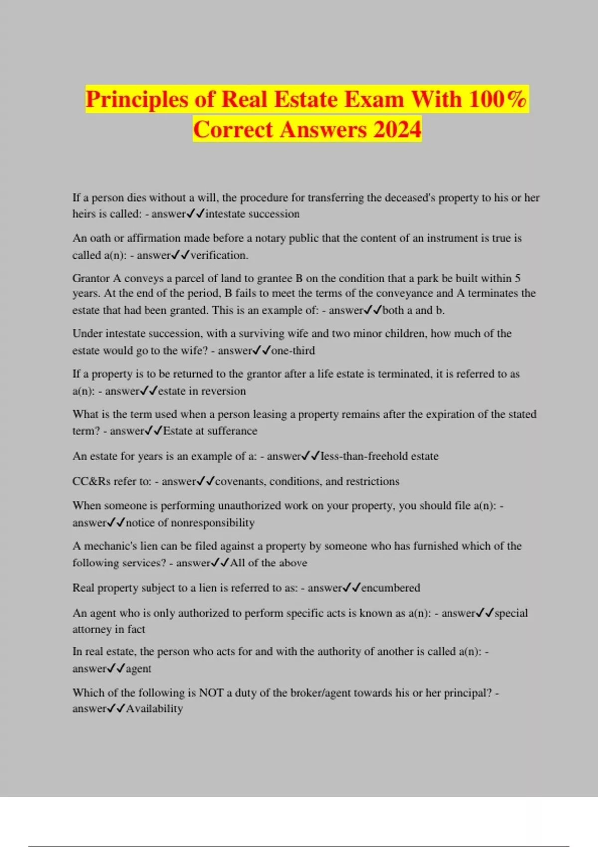Principles of Real Estate Exam With 100% Correct Answers 2024 If a person dies without a will, the procedure for transferring the deceased's property to his or her heirs is called: - answerintestate succession An oath or affirmation made before a notary public that the content of an instrument is true is called a(n): - answerverification. Grantor A conveys a parcel of land to grantee B on the condition that a park be built within 5 years. At the end of the period, B fails to meet the terms of the conveyance and A terminates the estate that had been granted. This is an example of: - answerboth a and b. Under intestate succession, with a surviving wife and two minor children, how much of the estate would go to the wife? - answerone-third If a property is to be returned to the grantor after a life estate is terminated, it is referred to as a(n): - answerestate in reversion What is the term used when a person leasing a property remains after the expiration of the stated term? - answerEstate at sufferance An estate for years is an example of a: - answerIess-than-freehold estate CC&Rs refer to: - answercovenants, conditions, and restrictions When someone is performing unauthorized work on your property, you should file a(n): - answernotice of nonresponsibility A mechanic's lien can be filed against a property by someone who has furnished which of the following services? - answerAll of the above Real property subject to a lien is referred to as: - answerencumbered An agent who is only authorized to perform specific acts is known as a(n): - answerspecial attorney in fact In real estate, the person who acts for and with the authority of another is called a(n): - answeragent Which of the following is NOT a duty of the broker/agent towards his or her principal? - answerAvailability If the "exact" terms of the listing agreement are met, the listing broker is entitled to a commission, even if the: - answerowner refuses to sell to the buyer Which kind of listing is preferred by most brokers? - answerExclusive right to sell The broker must place a buyer's money deposit in