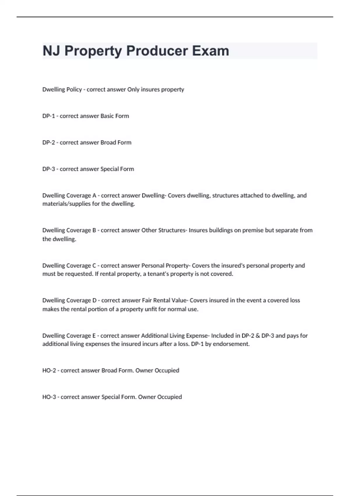 NJ Property Producer Exam Question and answers correctly solved 2023/2024Dwelling Policy - correct answer Only insures property DP-1 - correct answer Basic Form DP-2 - correct answer Broad Form DP-3 - correct answer Special Form Dwelling Coverage A - correct answer Dwelling- Covers dwelling, structures attached to dwelling, and materials/supplies for the dwelling. Dwelling Coverage B - correct answer Other Structures- Insures buildings on premise but separate from the dwelling. Dwelling Coverage C - correct answer Personal Property- Covers the insured's personal property and must be requested. If rental property, a tenant's property is not covered. Dwelling Coverage D - correct answer Fair Rental Value- Covers insured in the event a covered loss makes the rental portion of a property unfit for normal use. Dwelling Coverage E - correct answer Additional Living Expense- Included in DP-2 & DP-3 and pays for additional living expenses the insured incurs after a loss. DP-1 by endorsement. HO-2 - correct answer Broad Form. Owner Occupied HO-3 - correct answer Special Form. Ow