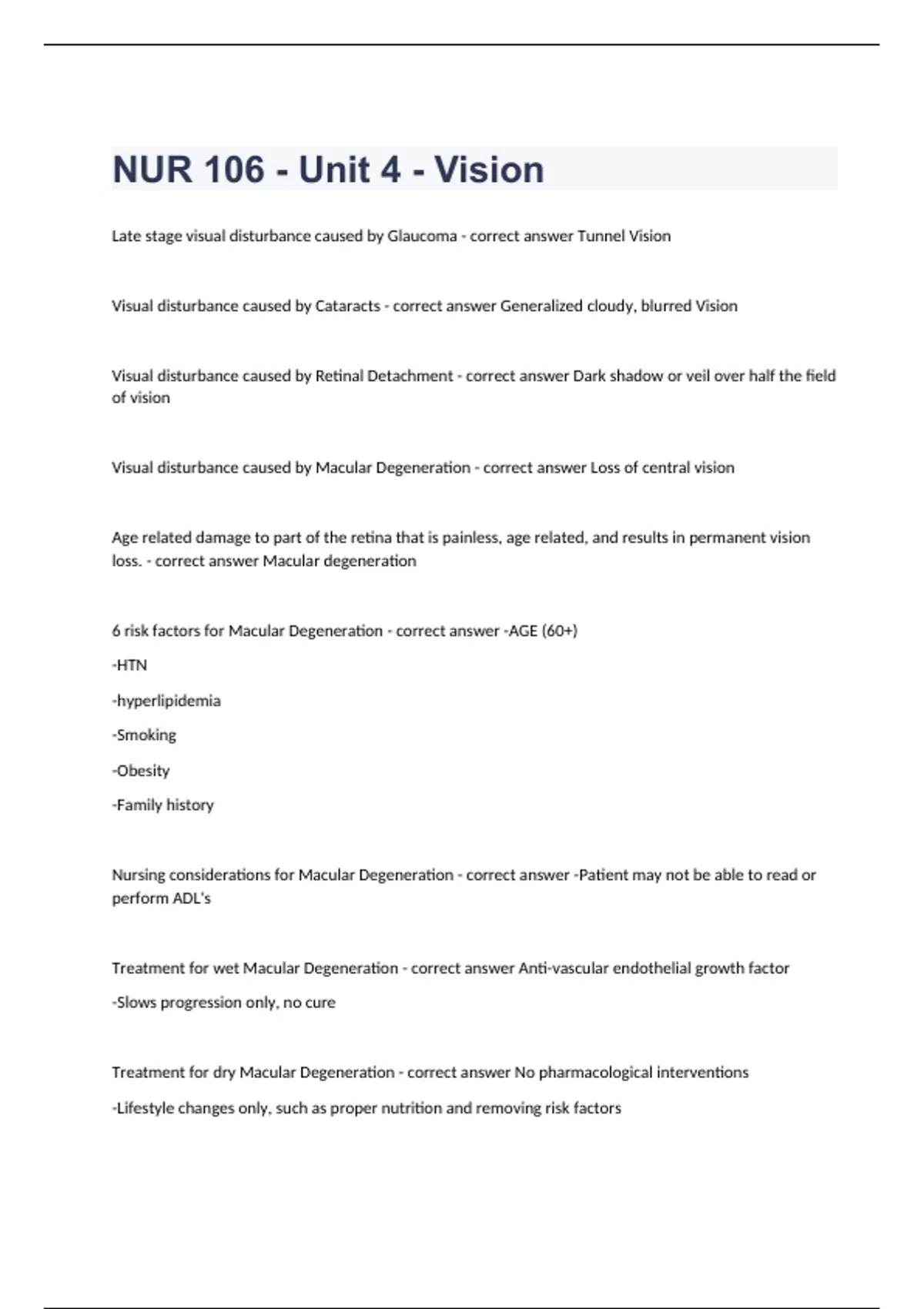 NUR 106 - Unit 4 - Vision Question and answers correctly solved 2023/2024Late stage visual disturbance caused by Glaucoma - correct answer Tunnel Vision Visual disturbance caused by Cataracts - correct answer Generalized cloudy, blurred Vision Visual disturbance caused by Retinal Detachment - correct answer Dark shadow or veil over half the field of vision Visual disturbance caused by Macular Degeneration - correct answer Loss of central vision Age related damage to part of the retina that is painless, age related, and results in permanent vision loss. - correct answer Macular degeneration 6 risk factors for Macular Degeneration - correct answer -AGE (60+) -HTN -hyperlipidemia -Smoking -Obesity -Family history Nursing considerations for Macular Degeneration - correct answer -Patient may not be able to read or perform ADL's Treatment for wet Macular Degeneration - correct answer Anti-vascular endothelial growth factor -Slows progression only, no cure Treatment for dry Macular Degeneration - correct answer No pharmacological interventions -Lifestyle changes only, such as proper nu