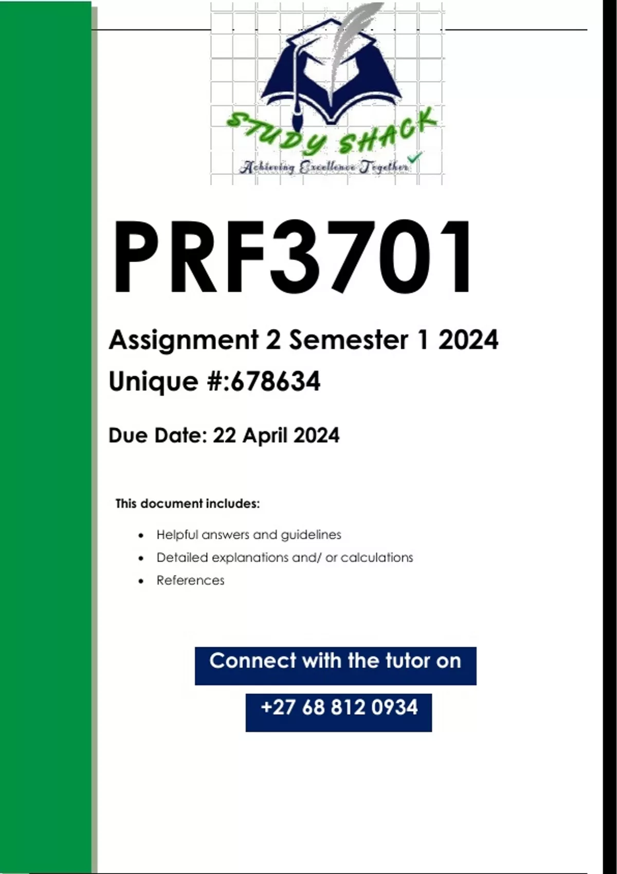 This document contains workings, explanations and solutions to the PRF3701 Assignment 2 (QUALITY ANSWERS) Semester 1 2024. For assistance call or us on 0.6.8..8.1.2..0.9.3.4..... QUESTION 1 Explain in your own words in three sentences for each concept, what the 1. following concepts mean, provide an in-text reference from any source for each of them, where these are discussed. 1.1 Ubuntu (5) 1.2 Individual — and situational moderators (5) 1.3 Theory in the criminal justice field (5) 2 Summarise Lesson 1 by focusing on the three aspects indicated below. Write five sentences for each aspect: 2.1 What is the core of Jean Piaget's theory of cognitive-developmental theory to moral development. (10) 2.2 How implementable is Lawrence Kohlberg's three levels of moral development in the South African context? Motivate your answer. (10) 3 Road Story 2 in Lesson 2 attentively and apply it to the following. 3.1 Explain in your own words what the concepts ego strength, field dependence and locus of control mean. (15)