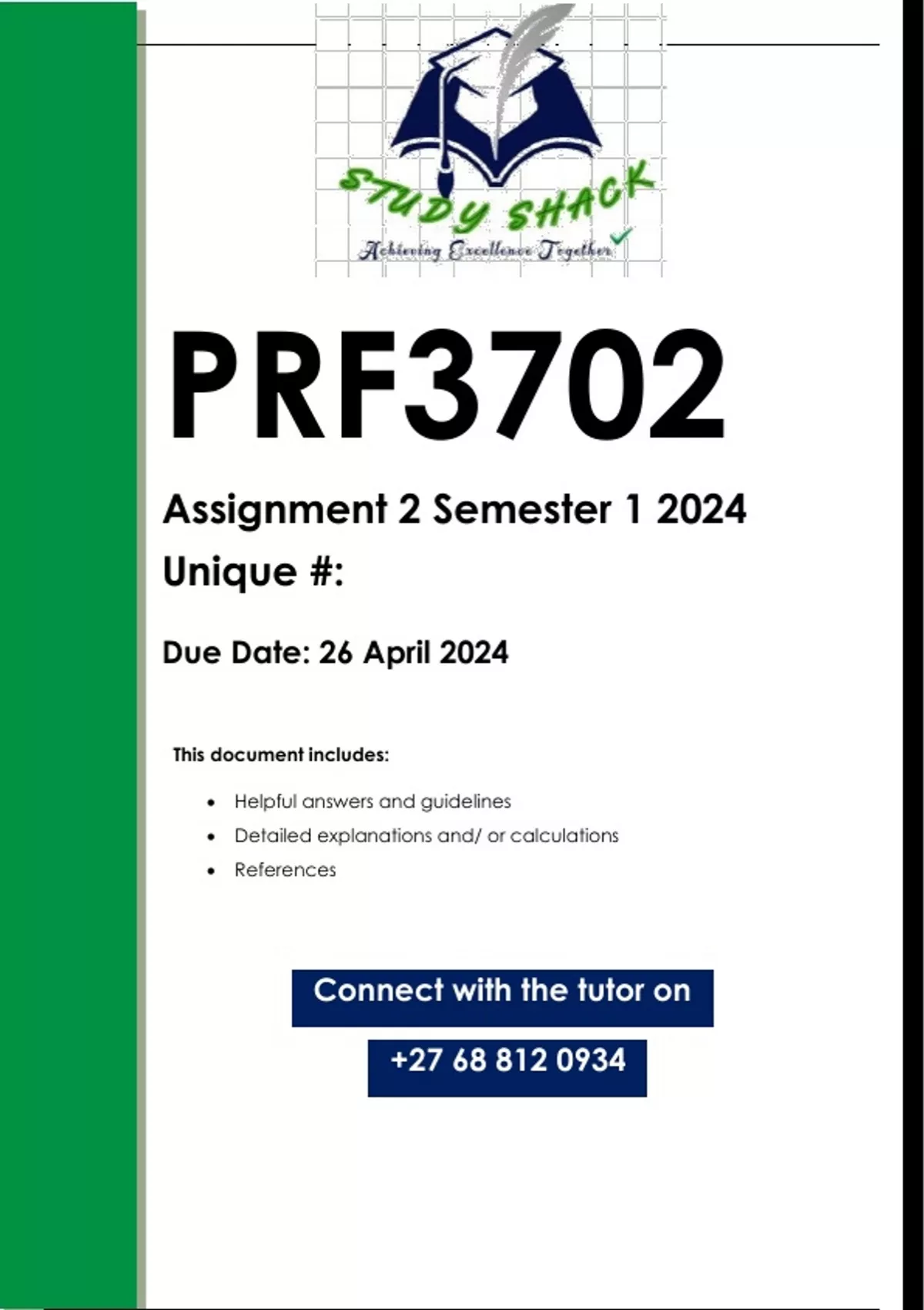 This document contains workings, explanations and solutions to the PRF3702 Assignment 2 (QUALITY ANSWERS) Semester 1 2024. For assistance call or us on 0.6.8..8.1.2..0.9.3.4.....QUESTION 1 1. Legal documents such as the Bill of Rights, the SAPS Act, the SAPS Code of Conduct, and the Batho Pele document stipulate that the South African Police Service (SAPS) must adhere to the eight principles of quality management. Explain in your own words, in one paragraph, what the following concepts mean. 1.1 Batho Pele document (5) 1.2 SAPS strategic plan. (5) 1.3 Gap analysis (5) QUESTION 2 2 Read Story 2 in Lesson 2 to familiarise yourself with the way to identify the need for training and awareness to promote a culture of ethical and accountable conduct in the work environment 2.1 A police officer needs seven competencies to function effectively and efficiently. List these competences. (5) 2.2 Performance management system is based on three principles. Discuss them in detail. (5) 2.3 Illustrate the eight steps in the research process (5) 2.4 Explain the structure, purpose and sources of Step 3: literature review. (10) PRF3702(S1)/page-2 2.5 The research design combines the philosophical world views of researchers. Discuss the advocacy world view. (5) 2.6 According to Step 8 – Writing a research report, discuss the four requirements that must be met in a research report.