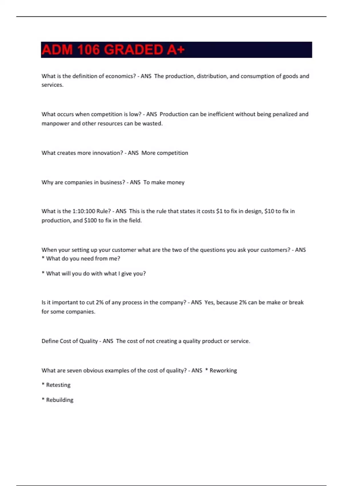 What is the definition of economics? - ANS The production, distribution, and consumption of goods and services. What occurs when competition is low? - ANS Production can be inefficient without being penalized and manpower and other resources can be wasted. What creates more innovation? - ANS More competition Why are companies in business? - ANS To make money What is the 1:10:100 Rule? - ANS This is the rule that states it costs $1 to fix in design, $10 to fix in production, and $100 to fix in the field. When your setting up your customer what are the two of the questions you ask your customers? - ANS * What do you need from me? * What will you do with what I give you? Is it important to cut 2% of any process in the company? - ANS Yes, because 2% can be make or break for some companies. Define Cost of Quality - ANS The cost of not creating a quality product or service. What are seven obvious examples of the cost of quality? - ANS * Reworking * Retesting * Rebuilding