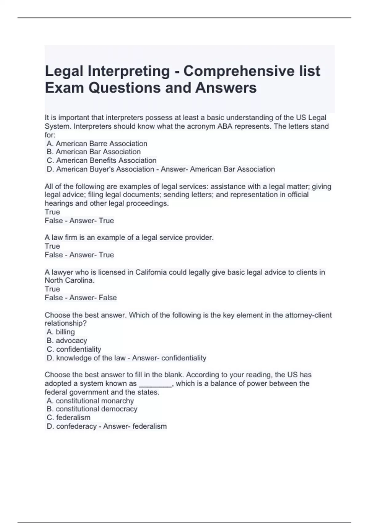 Legal Interpreting - Comprehensive list Exam Questions and Answers