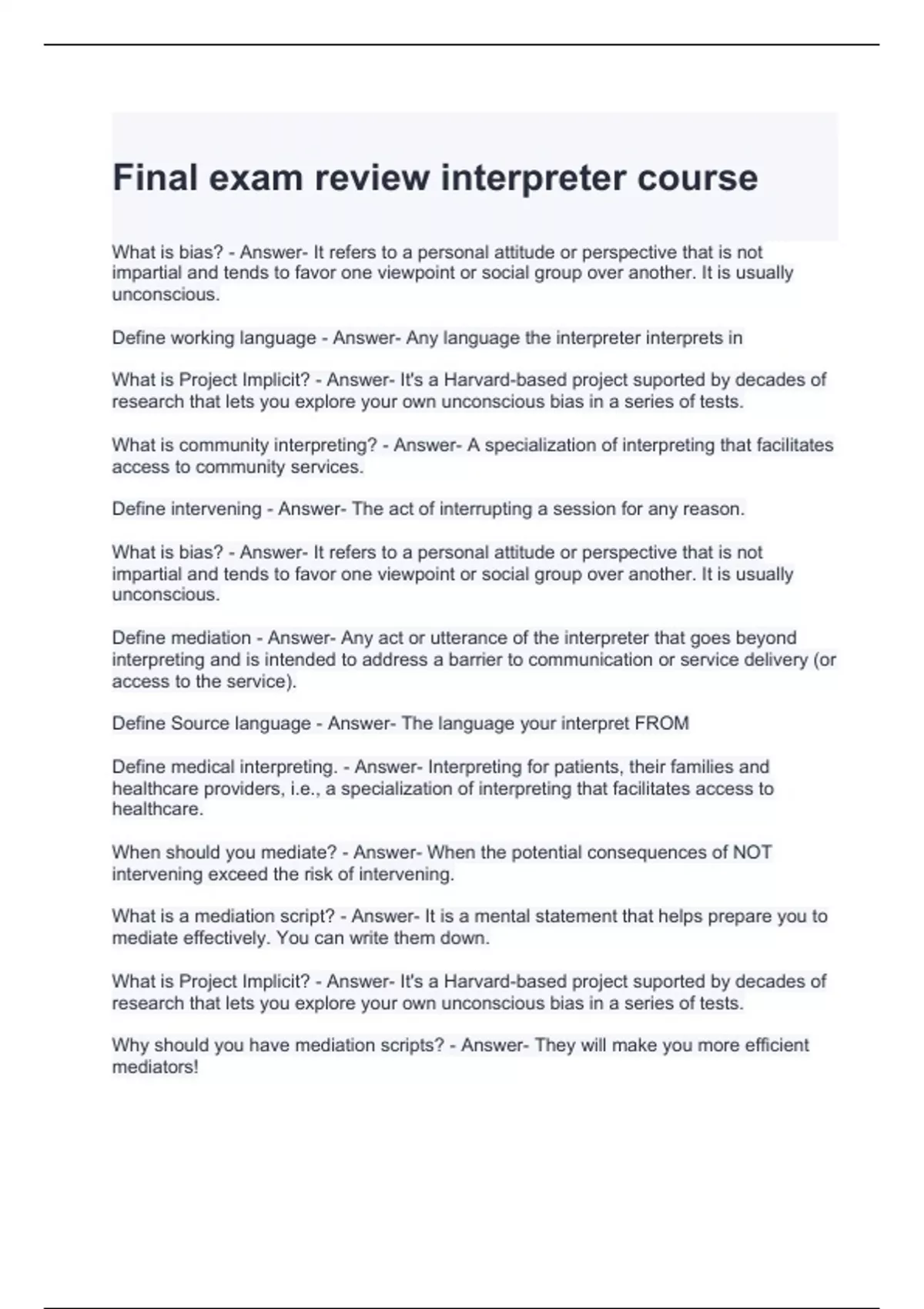 Final exam review interpreter course questions and answers