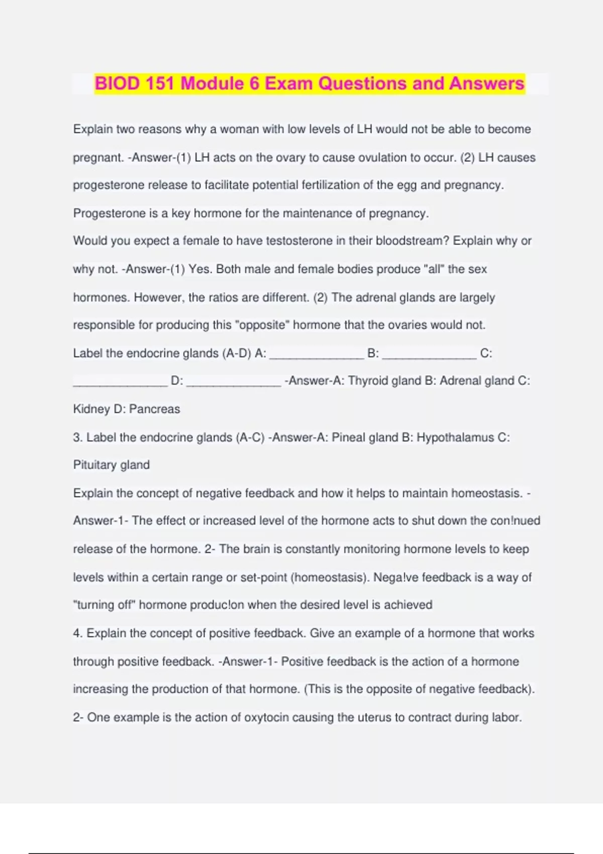 BIOD 151 Module 6 Exam Questions and Answers Explain two reasons why a woman with low levels of LH would not be able to become pregnant. -Answer-(1) LH acts on the ovary to cause ovulation to occur. (2) LH causes progesterone release to facilitate potential fertilization of the egg and pregnancy. Progesterone is a key hormone for the maintenance of pregnancy. Would you expect a female to have testosterone in their bloodstream? Explain why or why not. -Answer-(1) Yes. Both male and female bodies produce "all" the sex hormones. However, the ratios are different. (2) The adrenal glands are largely responsible for producing this "opposite" hormone that the ovaries would not. Label the endocrine glands (A-D) A: ______________ B: ______________ C: ______________ D: ______________ -Answer-A: Thyroid gland B: Adrenal gland C: Kidney D: Pancreas 3. Label the endocrine glands (A-C) -Answer-A: Pineal gland B: Hypothalamus C: Pituitary gland Explain the concept of negative feedback and how it helps to maintain homeostasis. - Answer-1- The effect or increased level of the hormone acts to shut down the con!nued release of the hormone. 2- The brain is constantly monitoring hormone levels to keep levels within a certain range or set-point (homeostasis). Nega!ve feedback is a way of "turning off" hormone produc!on when the desired level is achieved 4. Explain the concept of positive feedback. Give an example of a hormone that works through positive feedback. -Answer-1- Positive feedback is the action of a hormone increasing the production of that hormone. (This is the opposite of negative feedback). 2- One example is the action of oxytocin causing the uterus to contract during labor. Oxytocin enhances the effect of the uterus contractions, causing more oxytocin to be released. The positive feedback loop is stopped once the baby is born and the uterus no longer needs to contract, stopping the production of oxytocin. This type of hormone is derived from cholesterol: A. Peptide hormones B. Catecholamines C. Steroid hormones D. Tyrosine -Answer-C 5. This type of hormone is derived from proteins: A. Peptide hormones B. Catecholamines C. Steroid hormones D. Tyrosine -Answer-A 6. Growth hormone____ A. is most active during childhood/adolescence. B. can cause disease if levels are not correct. C. cannot affect an adult. D. A &B -Answer-D 6. Growth hormone______ A. is most active during adulthood. B. is produced by the anterior pituitary gland. C. underproduction is called acromegaly. D. A &C -Answer-B
