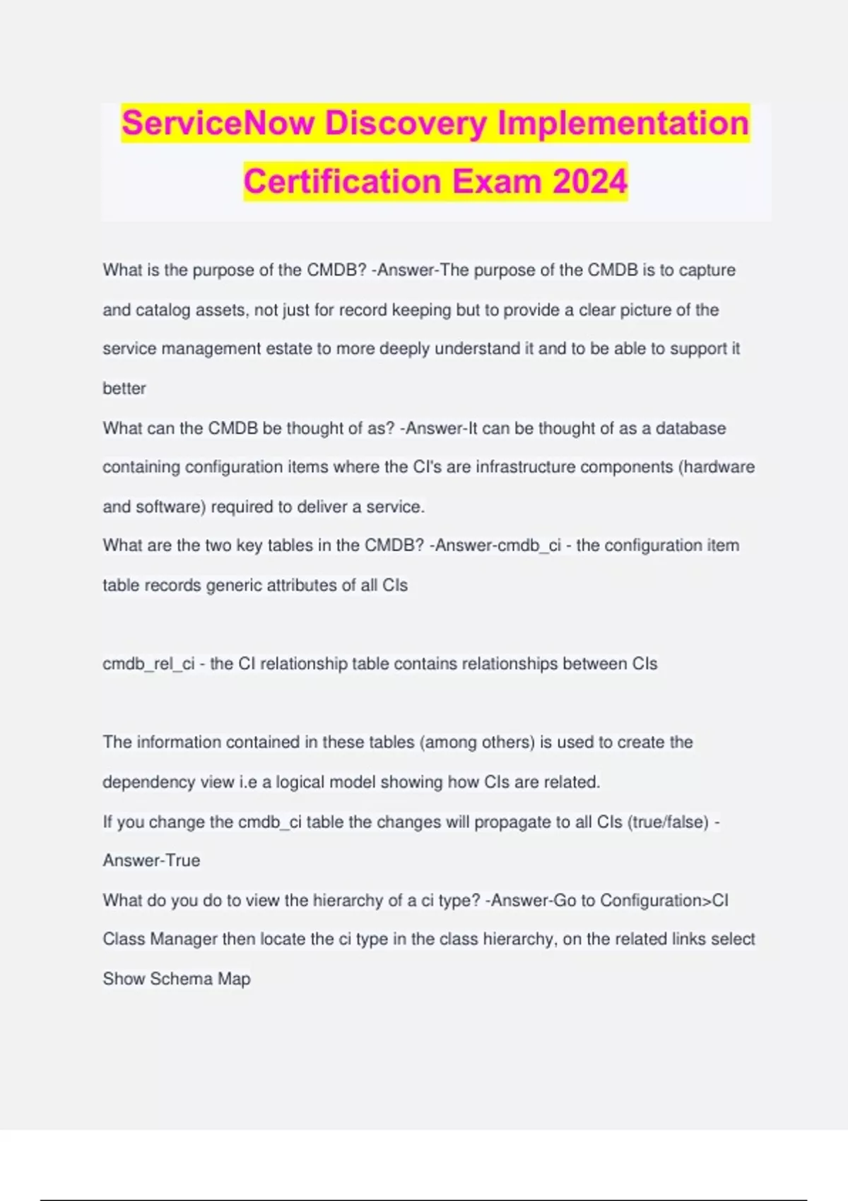 ServiceNow Discovery Implementation Certification Exam 2024 What is the purpose of the CMDB? -Answer-The purpose of the CMDB is to capture and catalog assets, not just for record keeping but to provide a clear picture of the service management estate to more deeply understand it and to be able to support it better What can the CMDB be thought of as? -Answer-It can be thought of as a database containing configuration items where the CI's are infrastructure components (hardware and software) required to deliver a service. What are the two key tables in the CMDB? -Answer-cmdb_ci - the configuration item table records generic attributes of all CIs cmdb_rel_ci - the CI relationship table contains relationships between CIs The information contained in these tables (among others) is used to create the dependency view i.e a logical model showing how CIs are related. If you change the cmdb_ci table the changes will propagate to all CIs (true/false) - Answer-True What do you do to view the hierarchy of a ci type? -Answer-Go to Configuration>CI Class Manager then locate the ci type in the class hierarchy, on the related links select Show Schema Map Do all service management processes use the CMDB? -Answer-Yes the CMDB is not just a storage of information about organizational assets, its usage is more important and virtually all service management processes use the CMDB in some way. What does the CMDB provide for visibility? -Answer-Simply put having a CMDB provides increased visibility of the infrastructure, enabling: Key decision makers to quickly make accurate and informed decisions. Support teams to investigate and resolve issues in a timely manner How does the CMDB benefit the Incident Management process? -Answer-The ability to identify how faulty CIs affect upstream services means being able to warn users of potential outages or reassure customers that work is currently in progress; relating component information to quick fixes (the KEDB) can affect faster workarounds. How does the CMDB benefit the Problem Management process? -Answer-Able to perform root cause analysis on related items, narrowing down the source of incidents and identify the faulty CI more quickly. How does the CMDB benefit the Change Management process? -Answer-Understand change impact for more informed decision-making, identify upstream services and CI's affected by a change so change schedules can minimize service disruption. How does the CMDB benefit the Security Management process? -Answer-Identify assets and their business value to ascertain monitoring and control requirements. Most organizations do not fully understand their environment, which introduces risk levels. What are some examples of these risks? -Answer--Support staff are not informed when devices are moved. -Technicians lack details of a new server added to the network. -Software is installed on corporate equipment without proper official approval. -Costs and fines associated with under or over-buying software licenses. What is the main consideration when starting initial CMDB design? -Answer-Thought should be given to the process of CMDB Maintenance. What is Discovery? -Answer-ServiceNow Discovery (also known as Infrastructure and Application discovery) interrogates the enterprise network for recognizable devices and applications they host. How does Discovery access the network? -Answer-Because ServiceNow is normally hosted in a data center, instances lack the ability to access the enterprise networks and sub nets directly, so must delegate the work to MID Servers placed inside the enterprise. What is a MID Server -Answer-A MID Server is a lightweight java process running under a Linux or Windows platform that resides within the enterprise networks. Does a MID Server require dedicated hardware? -Answer-A MID Servers resource consumption is very low (and controllable) and therefore dedicated hardware is usually not required. What is a MID Servers sole function? -Answer-The sole function of the MID Server is to execute work requests and return the results to a ServiceNow instance for processing