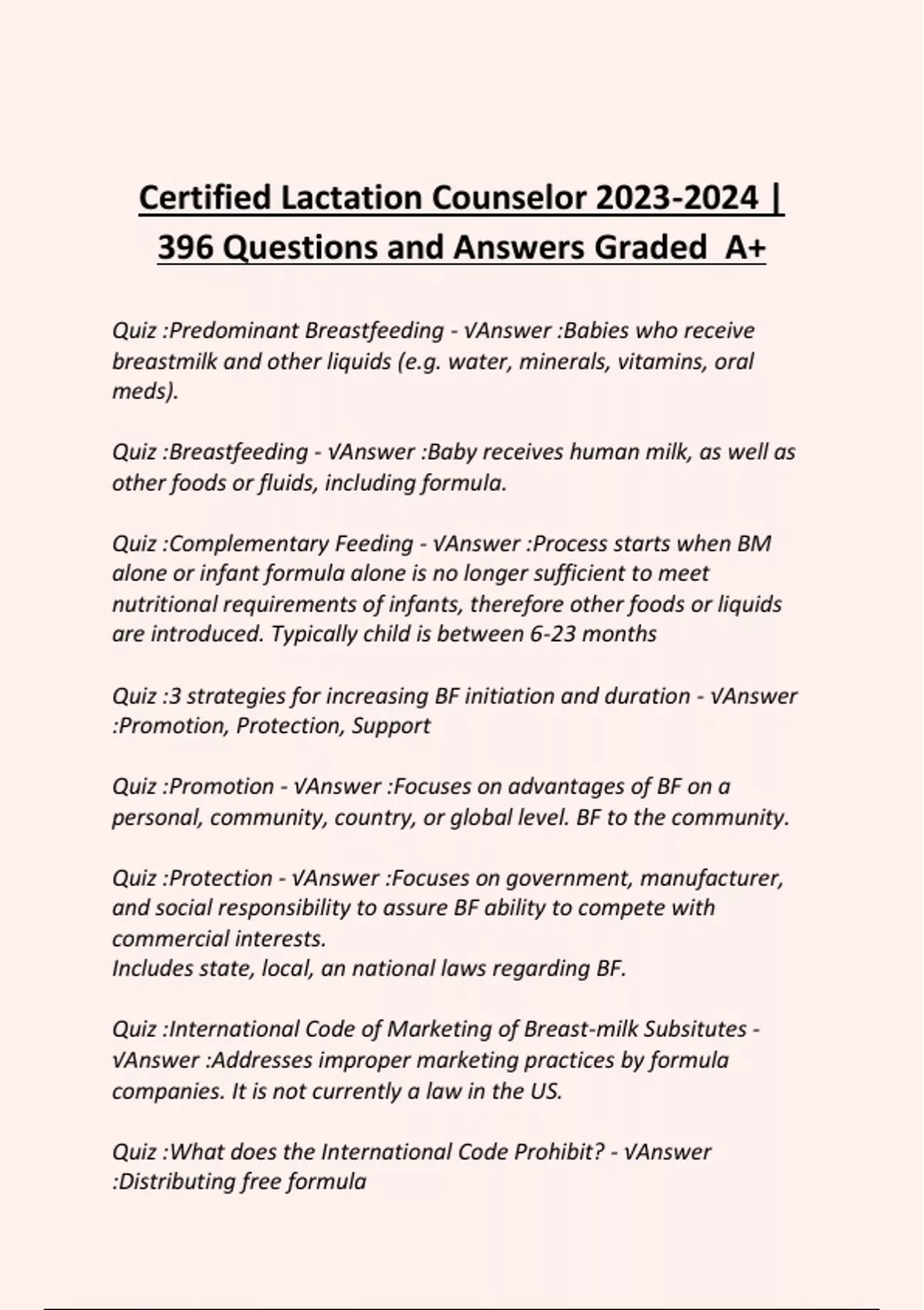 Certified Lactation Counselor | 396 Questions and Answers Graded A+