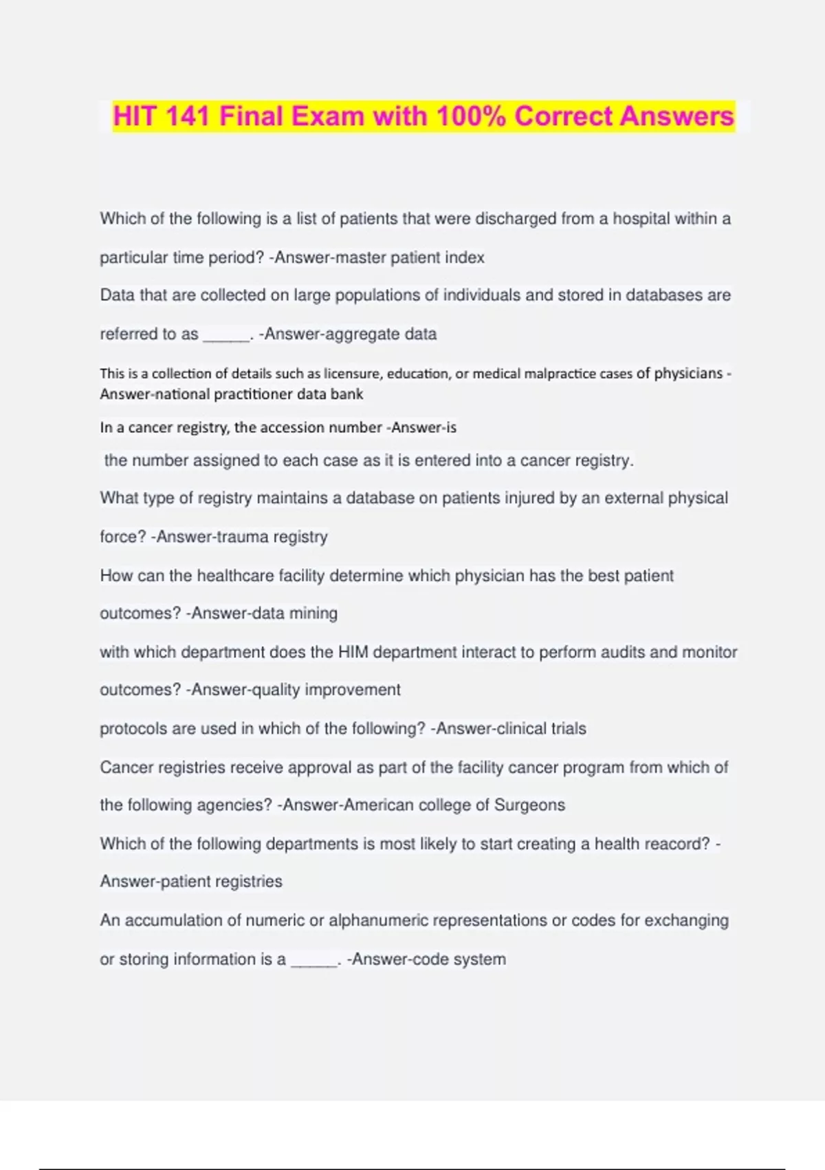 HIT 141 Final Exam with 100% Correct Answers Which of the following is a list of patients that were discharged from a hospital within a particular time period? -Answer-master patient index Data that are collected on large populations of individuals and stored in databases are referred to as _____. -Answer-aggregate data This is a collection of details such as licensure, education, or medical malpractice cases of physicians - Answer-national practitioner data bank In a cancer registry, the accession number -Answer-is the number assigned to each case as it is entered into a cancer registry. What type of registry maintains a database on patients injured by an external physical force? -Answer-trauma registry How can the healthcare facility determine which physician has the best patient outcomes? -Answer-data mining with which department does the HIM department interact to perform audits and monitor outcomes? -Answer-quality improvement protocols are used in which of the following? -Answer-clinical trials Cancer registries receive approval as part of the facility cancer program from which of the following agencies? -Answer-American college of Surgeons Which of the following departments is most likely to start creating a health reacord? - Answer-patient registries An accumulation of numeric or alphanumeric representations or codes for exchanging or storing information is a _____. -Answer-code system One of the required descriptions for a SNOMED CT concept is _____. -Answer- preferred term _____ is a nursing terminology. -Answer-Clinical Care Classification HCPCS is made up of which code systems? -Answer-CPT and HCPCS Level II The _____ is a system for classifying the topography and morphology of neoplasm. - Answer-ICD-O-3 Which of the following is the standard for clinical lab test results under the Meaningful Use program? -Answer-LOINC