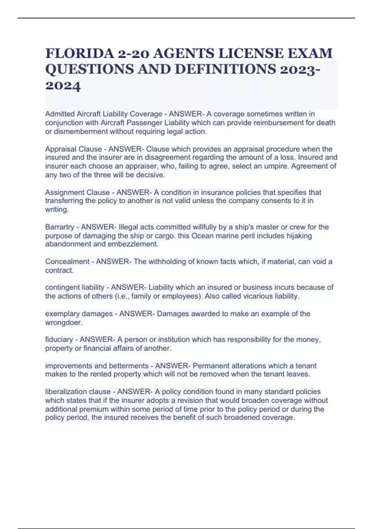 Florida 2-20 Agents License Exam Questions & Answers