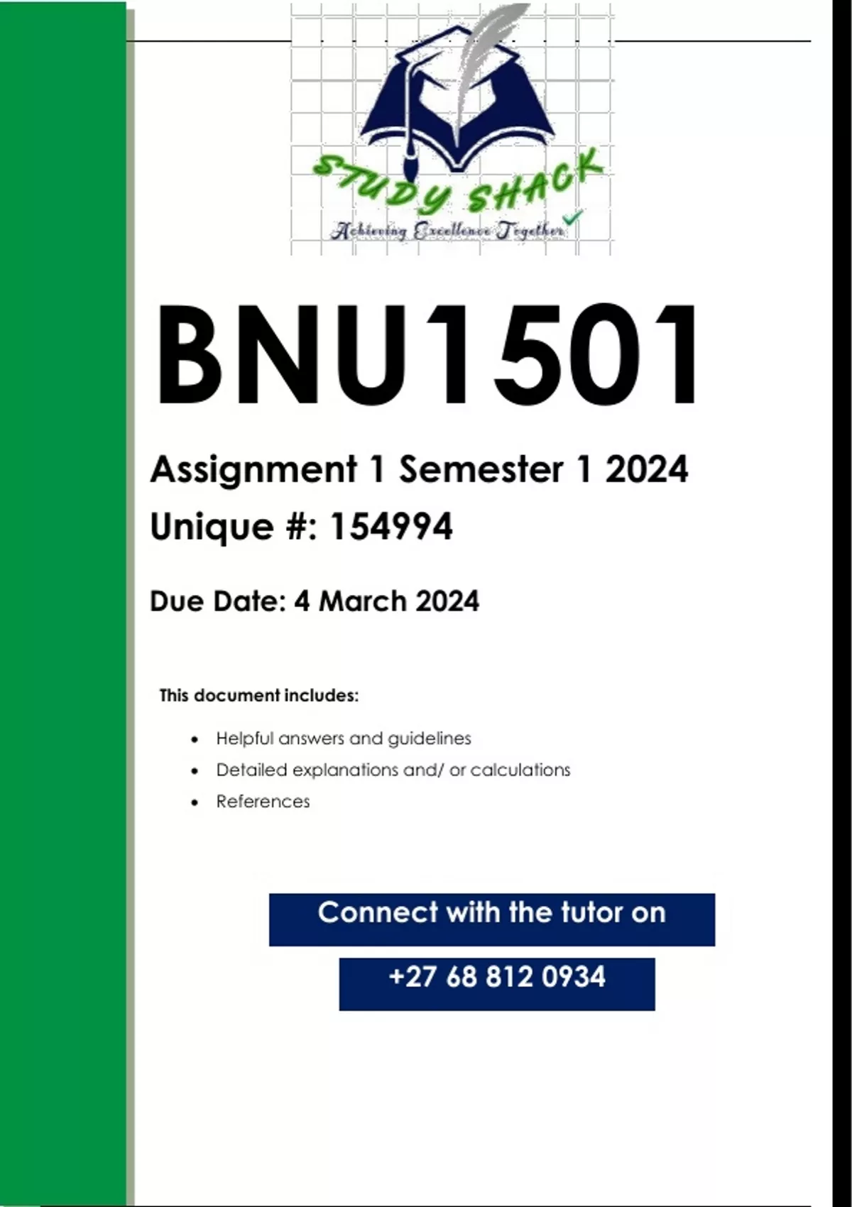 This document contains workings, explanations and solutions to the PSE4801 Assignment 3 (QUALITY ANSWERS) 2024. For assistance call or Whats-App us on 0.8.1..2.7.8..3.3.7.2........ Write an essay in not more than ten typed pages on why I consider an African philosophy of education to be most meaningful for an educator involved in teaching and learning in an African context. Structure your essay as follows: 1. Introduction to the essay in which you give your philosophical understanding of the following concept: 1.1 uBuntu” (5) 1.2 Communality (5) 1.3 Examine the challenge of establishing an African identity for philosophy of education to confront the problem of the “tyranny of colonialism”. (10) 1.4. Provide a critical account on why you consider an African philosophy of education to be most meaningful for an educator involved in teaching and learning in an African context. (15) 30 2. Body of the essay in which you should deal with the following: 2.1 A (post)Critical African philosophy of education (25) 2.2 Implications of an African philosophy of education for teaching and learning (25) 3. Conclusion to the essay in which you provide a strong justification why you consider an African philosophy of education to be most meaningful for an educator involved in teaching and learning in an African context. (No new information please) (10) 4. References You need to list the cited references alphabetically according to the Harvard Method of Reference. (5)