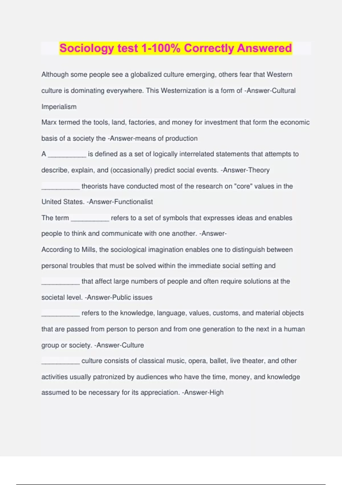 Sociology test 1-100% Correctly Answered Although some people see a globalized culture emerging, others fear that Western culture is dominating everywhere. This Westernization is a form of -Answer-Cultural Imperialism Marx termed the tools, land, factories, and money for investment that form the economic basis of a society the -Answer-means of production A __________ is defined as a set of logically interrelated statements that attempts to describe, explain, and (occasionally) predict social events. -Answer-Theory __________ theorists have conducted most of the research on "core" values in the United States. -Answer-Functionalist The term __________ refers to a set of symbols that expresses ideas and enables people to think and communicate with one another. -Answer- According to Mills, the sociological imagination enables one to distinguish between personal troubles that must be solved within the immediate social setting and __________ that affect large numbers of people and often require solutions at the societal level. -Answer-Public issues __________ refers to the knowledge, language, values, customs, and material objects that are passed from person to person and from one generation to the next in a human group or society. -Answer-Culture __________ culture consists of classical music, opera, ballet, live theater, and other activities usually patronized by audiences who have the time, money, and knowledge assumed to be necessary for its appreciation. -Answer-High Which of these statements is the best description of the role of culture in human life? - Answer-Humans choose their behaviors and ideas from a cultural " tool kit" The popularity of piñatas in China, Italy, Spain, Mexico, the United States, and other nations is an example of __________. -Answer-cultural diffusion Sociologists conducting research may formulate a(n) __________, which is a statement of the relationship between two or more variables. -Answer-hypothesis China, Brazil, and Mexico are considered examples of __________. -Answer-middle- income countries Current interest in Lady Gaga and the Kardashians is an example of a __________. - Answer-personality faid A potential danger of applying __________ is that taken to its extreme it may be used to justify practices that violate human rights. -Answer-cultural relativism Clay is a high-ranking executive of the Harley-Davidson Company. He is a member of the Free Wheelers, a motorcycle group. On the weekends, the Free Wheelers go camping and fishing and often sponsor community service programs. Clay would be considered a member of a(n) __________. -Answer-subculture Jill attends college in order to study accounting so that she can work as an accountant. Merton would consider this a __________ function of college. -Answer-manifest British sociologist __________ translated and condensed Comte's work and was noted for her study of social customs in Great Britain and the United States. -Answer-Harriet Martineau __________ are norms considered to be less important, are unwritten, and are commonly understood standards of behavior among people who share an identity. - Answer-Informal norms __________ norms state what behavior is appropriate or acceptable. For example, persons making a certain amount of money are expected to file a tax return and pay any taxes they owe. -Answer-Prescriptive The text uses the examples of "dichos," proverbs or sayings used by Latinos in New Mexico and south Texas, to illustrate that________________ -Answer-language is a reflection of one's cultural heritage __________ refers to the fact that the lives of people everywhere are intertwined closely so that one nation's problems are part of a much larger global context. -Answer-global interdependance A __________ is a group that strongly rejects dominant societal values and norms and seeks an alternative lifestyle. -Answer-counterculture Durkheim used the term __________ for the condition in which social control becomes ineffective as a result of the loss of shared values and a sense of purpose in society. - Answer-anomie The cultural heritage or identity of a group, based on factors such as language or country of origin, is termed __________. -Answer-ethnicity A __________ analysis examines whole societies, large-scale social structures, and social systems. -Answer-macrolevel Interest in the systematic study of people's behavior and ideas took hold during the nineteenth century primarily in response to __________. -Answer-industrialization and urbanization The __________ suggests that language not only expresses our thoughts and perceptions but also influences our perception of reality. -Answer-Sapir-whorf hypothesis The term __________ refers to unlearned, biologically determined impulses common to all members of a species that satisfy needs such as those for sleep, food, water, or sexual gratification. -Answer-drive __________ consists of the physical or tangible creations that members of a society make, use, and share. -Answer-material culture A significant difference between high-income and low-income countries is that low- income countries tend to be __________. -Answer-more agrarian __________ state what behavior is inappropriate or unacceptable. Laws that prohibit stealing and norms against swearing in public are examples. -Answer-proscriptivee norms The world's __________ countries are nations with highly industrialized economies; technologically advanced industrial, administrative, and service occupations; and relatively high levels of national and personal income -Answer-high-income The "thumbs up" sign means something is good in some places, but is an obscene gesture in other places. This illustrates that_________________________ . -Answer- symbols may have different meanings among different groups of people