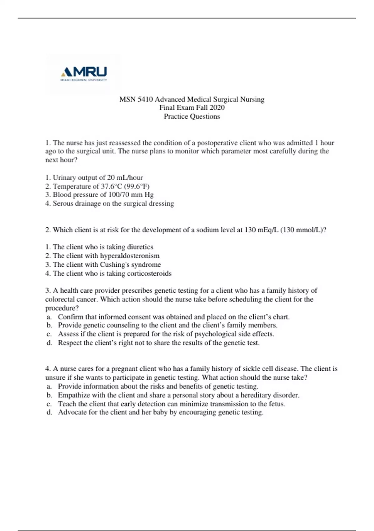 MSN 5410 Advanced Medical Surgical Nursing Final Exam Fall 2020 Practice Questions The nurse has just reassessed the condition of a postoperative client who was admitted 1 hour ago to the surgical unit. The nurse plans to monitor which parameter most carefully during the next hour? 1. Urinary output of 20 mL/hour 2. Temperature of 37.6°C (99.6°F) 3. Blood pressure of 100/70 mm Hg 4. Serous drainage on the surgical dressing 2. Which client is at risk for the development of a sodium level at 130 mEq/L (130 mmol/L)? 1. The client who is taking diuretics 2. The client with hyperaldosteronism 3. The client with Cushing's syndrome 4. The client who is taking corticosteroids 3. A health car