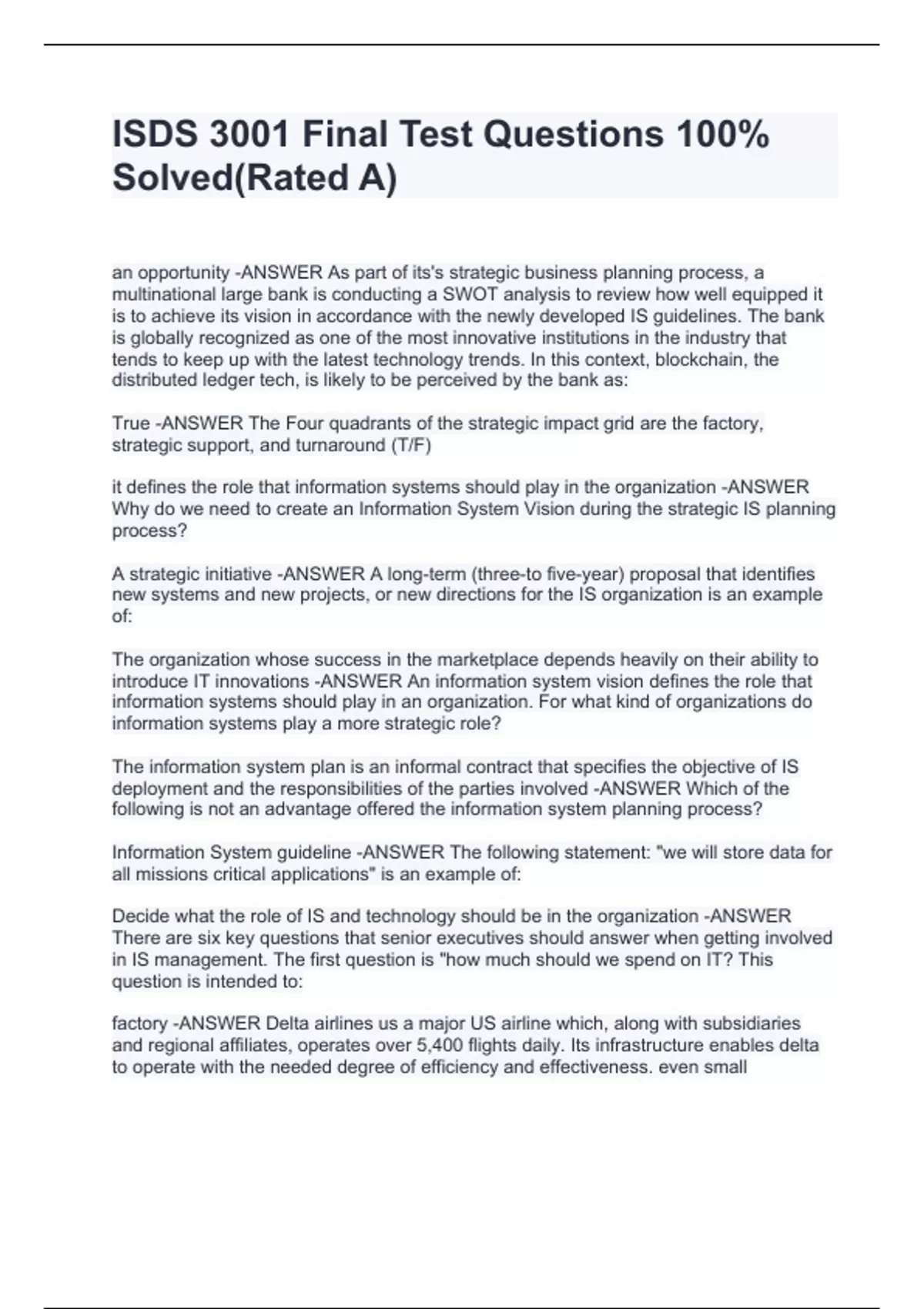 ISDS 3001 Final Test Questions 100% Solvedan opportunity -ANSWER As part of its's strategic business planning process, a multinational large bank is conducting a SWOT analysis to review how well equipped it is to achieve its vision in accordance with the newly developed IS guidelines. The bank is globally recognized as one of the most innovative institutions in the industry that tends to keep up with the latest technology trends. In this context, blockchain, the distributed ledger tech, is likely to be perceived by the bank as: True -ANSWER The Four quadrants of the strategic impact grid are the factory, strategic support, and turnaround (T/F) it defines the role that information systems should play in the organization -ANSWER Why do we need to create an Information System Vision during the strategic IS planning process? A strategic initiative -ANSWER A long-term (three-to five-year) proposal that identifies new systems and new projects, or new directions for the IS organization is an example of: The organization whose success in the marketplace depends heavily on their ability to introduce IT innovations -ANSWER An information system vision defines the role that information systems should play in an organization. For what kind of organizations do information systems play a more strategic role? The information system plan is an informal contract that specifies the objective of IS deployment and the responsibilities of the parties involved -ANSWER Which of the following is not an advantage offered the information system planning process? Information System guideline -ANSWER The following statement: "we will store data for all missions critical applications" is an example of: Decide what the role of IS and technology should be in the organization -ANSWER There are six key questions that senior executives should answer when getting involved in IS management. The first question is "how much should we spend on IT? This question is intended to: factory -ANSWER Delta airlines us a major US airline which, along with subsidiaries and regional affiliates, operates over 5,400 flights daily. Its infrastructure enables delta to operate (Rated A)