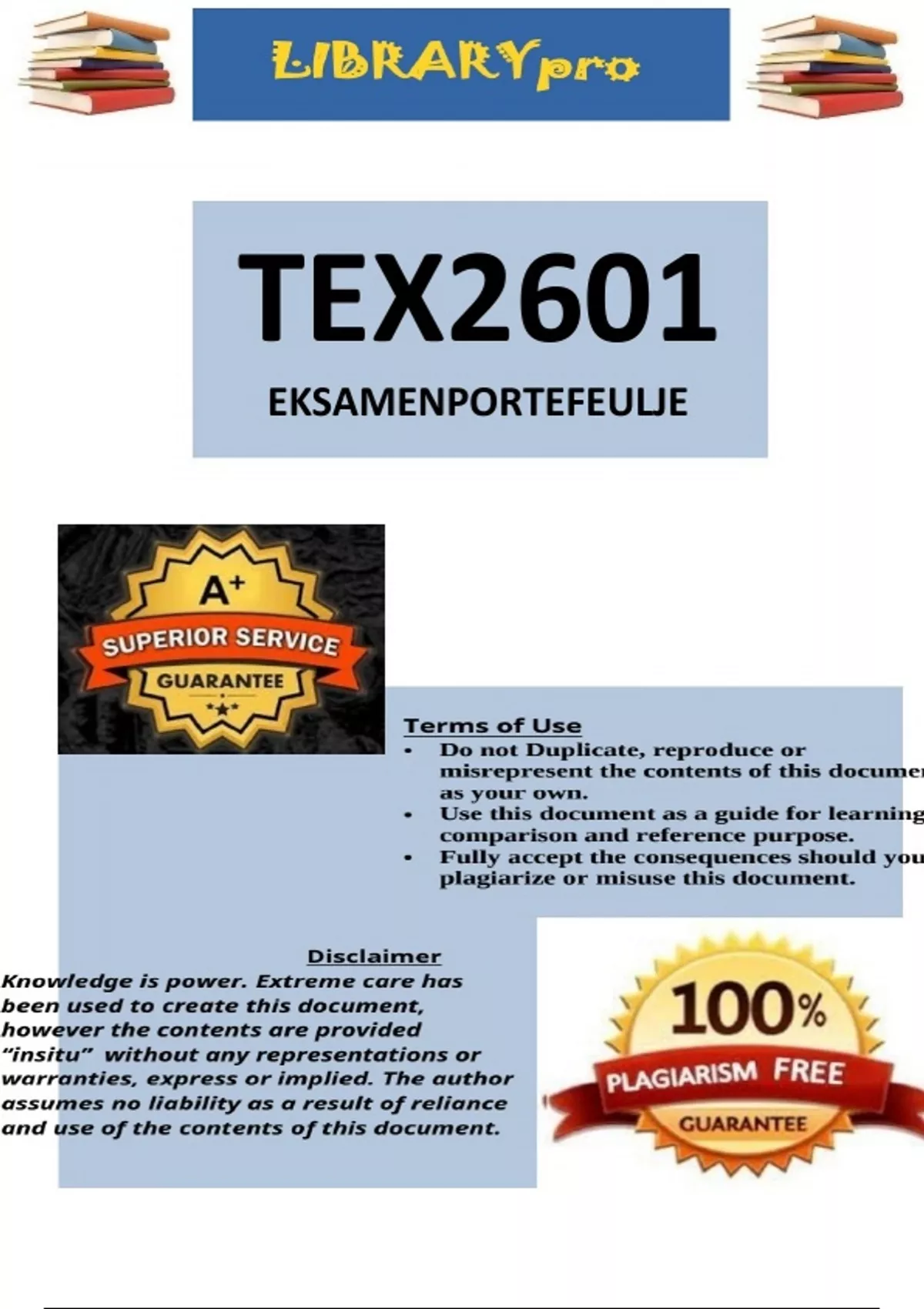 TEX2601 EKSAMENPORTEFEULJE 2024 (Assignment 6) TEX2601 EKSAMENPORTEFEULJE 2024 (Assignment 6 Semester 1 2024) Sperdatum: 14 Mei 2024 Navra: Mnr. Frik Broodryk 012 429 | (e-pos is die beste manier) Studiemateriaal: Hierdie eksamenportefeulje is hoofsaaklik op die inhoud van Les 1 en Les 2 gebaseer. Formaat: Ons verkies dat jy jou opdrag moet tik en na PDF-formaat omskakel voor jy jou opdrag op myUnisa indien. Jy moet slegs een dokument ingee. Puntetoekenning: ʼn Totaal van 80 punte: Vraag 1: 10 punte Vraag 2: 10 punte Vraag 3: 30 punte Vraag 4: 30 punte Let op: • Jy kan nie jou antwoorde op enige van die vrae op jou eie onderwerpe baseer nie. Jy moet die vrae beantwoord deur die inligting wat in elke vraag gegee word te gebruik. Jou antwoorde moet altyd gebaseer wees op die notas wat in elke vraag verskaf word. • Jy mag nie van kunsmatige intelligensie (KI) gebruikmaak nie, behalwe waar daar van jou verwag word om wel van KI gebruik te maak. • Lees stadig. • Gaan jou spelling en taalgebruik na. VRAAG 1 (10) Sagtenuusartikels begin met sagte inleidings wat nie die hooffeite opsom deur die w-vrae (wie, wat, waar, wanneer en waarom), te beantwoord nie. In plaas daarvan funksioneer sagte inleidings as lusmakers om die leser te laat belangstel om die artikel te lees. Identifiseer die relevante sagte inleiding in elk van die volgende gevalle: 1.1 Het jy al ooit gewonder wat dryf die kreatiewe mense wat vir baanbrekende innovasies verantwoordelik is? In ʼn eksklusiewe onderhoud onthul die bekende wetenskaplike, dr. Emily Makobane