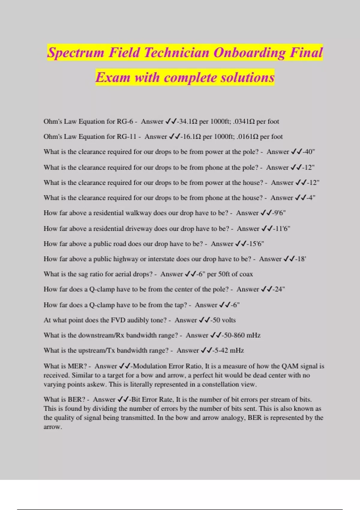 Spectrum Field Technician Onboarding Final Exam with complete solutions Ohm's Law Equation for RG-6 - Answer ️️ -34.1Ω per 1000ft; .0341Ω per foot Ohm's Law Equation for RG-11 - Answer ️️ -16.1Ω per 1000ft; .0161Ω per foot What is the clearance required for our drops to be from power at the pole? - Answer ️️ -40" What is the clearance required for our drops to be from phone at the pole? - Answer ️️ -12" What is the clearance required for our drops to be from power at the house? - Answer ️️ -12" What is the clearance required for our drops to be from phone at the house? - Answer ️️ -4" How far above a residential walkway does our drop have to be? - Answer ️️ -9'6" How far above a residential driveway does our drop have to be? - Answer ️️ -11'6" How far above a public road does our drop have to be? - Answer ️️ -15'6" How far above a public highway or interstate does our drop have to be? - Answer ️️ -18' What is the sag ratio for aerial drops? - Answer ️️ -6" per 50ft of coax How far does a Q-clamp have to be from the center of the pole? - Answer ️️ -24" How far does a Q-clamp have to be from the tap? - Answer ️️ -6" At what point does the FVD audibly tone? - Answer ️️ -50 volts What is the downstream/Rx bandwidth range? - Answer ️️ -50-860 mHz What is the upstream/Tx bandwidth range? - Answer ️️ -5-42 mHz What is MER? - Answer ️️ -Modulation Error Ratio, It is a measure of how the QAM signal is received. Similar to a target for a bow and arrow, a perfect hit would be dead center with no varying points askew. This is literally represented in a constellation view. What is BER? - Answer ️️ -Bit Error Rate, It is the number of bit errors per stream of bits. This is found by dividing the number of errors by the number of bits sent. This is also known as the quality of signal being transmitted. In the bow and arrow analogy, BER is represented by the arrow