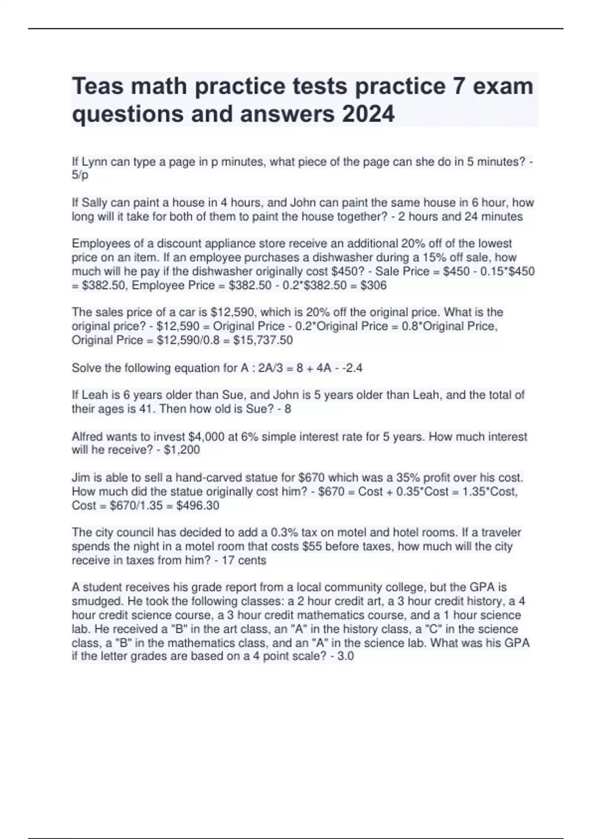If Lynn can type a page in p minutes, what piece of the page can she do in 5 minutes? - 5/p If Sally can paint a house in 4 hours, and John can paint the same house in 6 hour, how long will it take for both of them to paint the house together? - 2 hours and 24 minutes Employees of a discount appliance store receive an additional 20% off of the lowest price on an item. If an employee purchases a dishwasher during a 15% off sale, how much will he pay if the dishwasher originally cost $450? - Sale Price = $450 - 0.15*$450 = $382.50, Employee Price = $382.50 - 0.2*$382.50 = $306 The sales price of a car is $12,590, which is 20% off the original price. What is the original price? - $12,590 = Original Price - 0.2*Original Price = 0.8*Original Price, Original Price = $12,590/0.8 = $15,737.50 Solve the following equation for A : 2A/3 = 8 + 4A - -2.4 If Leah is 6 years older than Sue, and John is 5 years older than Leah, and the total of their ages is 41. Then how old is Sue? - 8 Alfred wants to invest $4,000 at 6% simple interest rate for 5 years. How much interest will he receive? - $1,200 Jim is able to sell a hand-carved statue for $670 which was a 35% profit over his cost. How much did the statue originally cost him? - $670 = Cost + 0.35*Cost = 1.35*Cost, Cost = $670/1.35 = $496.30 The city council has decided to add a 0.3% tax on motel and hotel rooms. If a traveler spends the night in a motel room that costs $55 before taxes, how much will the city receive in taxes from him? - 17 cents A student receives his grade report from a local community college, but the GPA is smudged. He took the following classes: a 2 hour credit art, a 3 hour credit history, a 4 hour credit science course, a 3 hour credit mathematics course, and a 1 hour science lab. He received a "B" in the art class, an "A" in the history class, a "C" in the science class, a "B" in the mathematics class, and an "A" in the science lab. What was his GPA if the letter grades are based on a 4 point scale? - 3.0 Simon arrived at work at 8:15 A.M. and left work at 10: 30 P.M. If Simon gets paid by the hour at a rate of $10 and time and ½ for any hours worked over 8 in a day. How much did Simon get paid? - $173.75 Grace has 16 jellybeans in her pocket. She has 8 red ones, 4 green ones, and 4 blue ones. What is the minimum number of jellybeans she must take out of her pocket to ensure that she has one of each color? - 13 If r = 5 z then 15 z = 3 y, then r = - y If 300 jellybeans cost you x dollars. How many jellybeans can you purchase for 50 cents at the same rate? - 150/x Lee worked 22 hours this week and made $132. If she works 15 hours next week at the same pay rate, how much will she make? - $90 If 8x + 5x + 2x + 4x = 114, the 5x + 3 = - 33 You need to purchase a textbook for nursing school. The book cost $80.00, and the sales tax where you are purchasing the book is 8.25%. You have $100. How much change will you receive back? - $13.40 You purchase a car making a down payment of $3,000 and 6 monthly payments of $225. How much have you paid so far for the car? - $4350 Your supervisor instructs you to purchase 240 pens and 6 staplers for the nurse's station. Pens are purchased in sets of 6 for $2.35 per pack. Staplers are sold in sets of 2 for 12.95. How much will purchasing these products cost? - $132.85 If y = 3, then y3(y3-y)= - 648 If the average of three numbers is V. If one of the numbers is Z and another is Y, what is the remaining number? - 3V- Z - Y Two cyclists start biking from a trail's start 3 hours apart. The second cyclist travels at 10 miles per hour and starts 3 hours after the first cyclist who is traveling at 6 miles per hour. How much time will pass before the second cyclist catches up with the first from the time the second cyclist started biking? - 4 ½ hours Jim can fill a pool carrying buckets of water in 30 minutes. Sue can do the same job in 45 minutes. Tony can do the same job in 1 ½ hours. How quickly can all three fill the pool together? - 15 minutes Mary is reviewing her algebra quiz. She has determined that one of her solutions is incorrect. Which one is it? - t - 2t - 3t = 32, t = 8