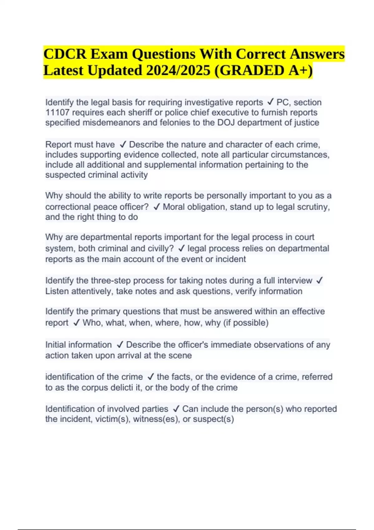 CDCR Exam Questions With Correct Answers Latest Updated 2024/2025 (GRADED A+) Why should the ability to write reports be personally important to you as a correctional peace officer? Moral obligation, stand up to legal scrutiny, and the right thing to do Why are departmental reports important for the legal process in court system, both criminal and civilly? legal process relies on departmental reports as the main account of the event or incident Identify the three-step process for taking notes during a full interview Listen attentively, take notes and ask questions, verify information Identify the primary questions that must be answered within an effective report Who, what, when, where, how, why (if possible) Initial information Describe the officer's immediate observations of any action taken upon arrival at the scene identification of the crime the facts, or the evidence of a crime, referred to as the corpus delicti it, or the body of the crime Identification of involved parties Can include the person(s) who reported the incident, victim(s), witness(es), or suspect(s) CDCR Exam Questions With Correct Answers Latest Updated 2024/2025 (GRADED A+) Witness/victim statements: helps place events in their proper sequence, establish the elements of the crime Crime scene specifics Physical condition of the scene it's self, chronology of events, location of physical evidence Property information: Such as brand names, model/serial numbers, description like color, unique markings and dimensions, value of stolen item, Location where the item was found or stolen and relationship of the item to the crime/incident CDCR correctional officer actions Complete report should clearly identify all actions taken by an officer, actions can include Searches conducted, seizures of evidence, arrests, standard procedures such as knock and notice, field show up, Miranda admonishments, use of force, medical attention, safety measures taken, disposition of suspect, methods used to preserve evidence or capture essential information CDCR memorandum Written for a variety of reasons, including lost staff identification card, observed misconduct by staff or reports of inspection Counseling only RVR used to document an inmates minor misconduct CDCR form 128-B General chrono There are three types of this form 1 informational, 2 laudatory, and 3 confidential RVR use to document inmates misconduct or misbehavior that is not minor, categorized as either serious or administrative CDCR form 837-C staff report and C1 supplement used to document an incident you observed or were involved in CDCR form 837-C2 Review Notice use when the information you present on a CDCR form 837-C and C1 is unclear or incomplete Identify the types of information classified as confidential under CCR title 15, Section 3321 Information, which, if known to the inmate, will endanger the safety of any person, information which would jeopardize the safety of the institution, specific medical or psychological information which, if known to the inmate would be medically or psychologically detrimental to the inmate, Information provided and classified confidential by another governmental agency Identify why inmate counts are conducted per the Department Operations Manual (DOM 52020 To facilitate inmate control, to facilitate accountability and to expedite inmate movement throughout the institution Identify the primary reasons for conduct inmate counts Accountability, institutional safety and security, public safety, employee safety and inmate security How many Count does the department should have in a calendar day At least 4 times Positive count A physical count of inmates present and seen by the officer Out count A count of inmates who are away from their assigned housing units at the time of the institution's count Standing count Inmates stand at their cell door or sit on their assigned bed NOTE! at least one daily count must be standing using the standard of "seeing living and breathing flesh" Negative count A count of unoccupied beds in a housing unit Picture count Inmates use their state issued identification card, this is conducted when a positive or negative account does not clear Emergency count Conducted during a disturbance or emergency, major incidents, riots, escape, natural disaster, or inclement weather Informal count An officer's physical count and positive identification of all inmates under the direct supervision at work or program assignment Close custody count Inmates who are subject to close and constant supervision Limited visibility In emergency count Identify the requirements for completing a count slip Time count commended, actual number of inmates counted, location or area where the count was conducted, print name and signature of count officer, written in black or blue ink only, accuracy, error free, if you make a mistake, shred it and make a new one, and legibility Identify three of the professional and ethical responsibilities of an officer when conducting a search Practice good communication, be respectful, searches are non-punitive, maintain accountability of property and practice safety and security Identify one reason why searches are conducted promote safety, prevent escapes, prevent contraband, and reduce theft Identify when searches are conducted Routinely, randomly, and when there's reasonable suspicion Identify safety equipment used to conduct searches Personal protective equipment (PPE) gloves, Mirror and a flashlight Identify safety Precautions to take when conducting searches Stop and Look before you touch, do not run your fingers along the frame of a bad locker or anything you cannot see, Be aware of sharp items, remember inmates may hide razor blades or needles and most importantly get a cover officer Getting a cover officer is important when conducting a search To ensure there is no interference during the search, provide immediate assistance should an inmate become resistive or violent, alerts staff if additional assi