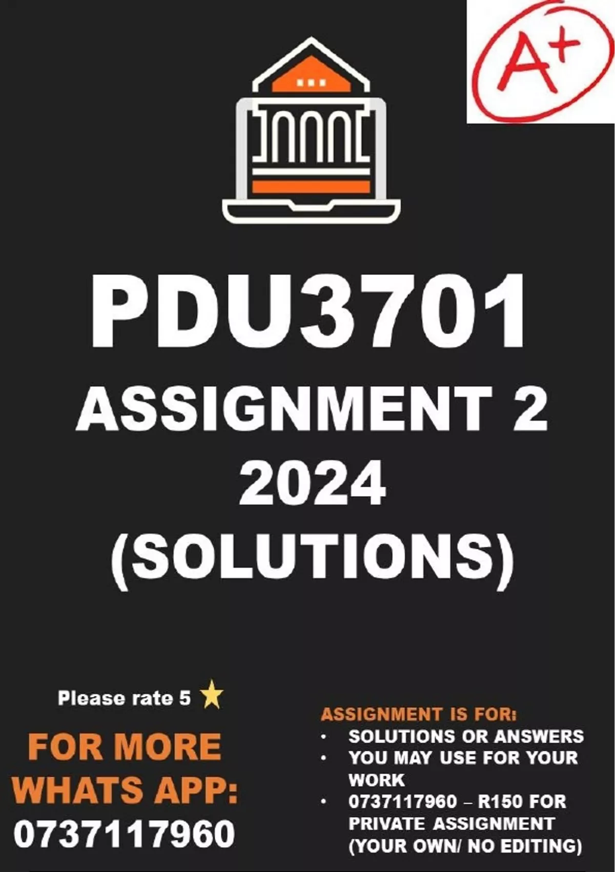 PDU3701 Assignment 2 2024 (solutions) 9.5.2 Assignment 02: Paragraph type questions: Mandatory assignment Question 1 1.1 African philosophy is concerned with attempting to reassert distinctively African ways of thinking and of relating to the world. In the light of this, what issues need to be addressed in education? List 4 issues. (8) 1.2 In responding to the question in 1.1, discuss the significance of ubuntu and communality for education. (Refer to pages 14-17 of Philosophy in Education Today: An Introduction) (20) 1.3 Name TWO educators associated with African philosophy. (2) (Refer to pages 15 and 17 of Philosophy in Education Today: An Introduction) 1.4 What is the intention of the Indigenous African Knowledge System Programme? (10) Refer to page 27 of Philosophy in Education Today: An Introduction) 16 1.5 What impact would the integration of indigenous African knowledge systems with Western knowledge systems have on the school curriculum in South Africa? (10) (Refer to page 29 of Philosophy in Education Today: An Introduction) (50) Question 2 Read Chapter 5: Hermeneutics and a hermeneutic philosophy of education in your prescribed textbook before responding to this question. 2.1 If, according to hermeneutics there is no ‘one right answer’ to a problem, given that answers are dependent on interpretation, can there ever be consensus on the quality thereof, of open distance e-learning? (10) 2.2 From and open distance e-learning standpoint what would be the arguments for or against privileging the STEM subjects (science, technology, engineering and mathematics) over humanities and social science areas of study? (10) 2.3 Reflect on the ODeL context in South Africa, and say whether you think it offers a supporting and enabling environment for a hermeneutical practice? (10) (30) Question 3: Read chapter 9: Postmodernism and philosophy of education in your prescribed textbook in responding to this question. 3.1 Why has Postmodernism to date, had little impact on government education schemes? (Refer to pages 128 of Philosophy in Education Today: An Introduction) (3) 3.2 What does Postmodernism focus on? (Refer to pages 128 of Philosophy in Education Today: An Introduction) (3) 3.3 Name THREE philosophers who were associated with Postmodernism (Refer to pages 129 of Philosophy in Education Today: An Introduction) (3) 3.4 What Postmodern concepts have been found to be very useful by educators? (Refer to page 130-131 of Philosophy in Education Today: An Introduction (3) 3.5 Identify TWO characteristics of Postmodernism (Refer to page 132 of Philosophy in Education Today: An Introduction) (2) 3.6 What Postmodern concepts have been found to be very useful by educators? (Refer to page 130-131 of Philosophy in Education Today: An Introduction ) (3) 3.7 How can Postmodernism help teacher with their classroom practice? (Refer to page 138-139 of Philosophy in Education Today: An Introduction) (3) (20) TOTAL
