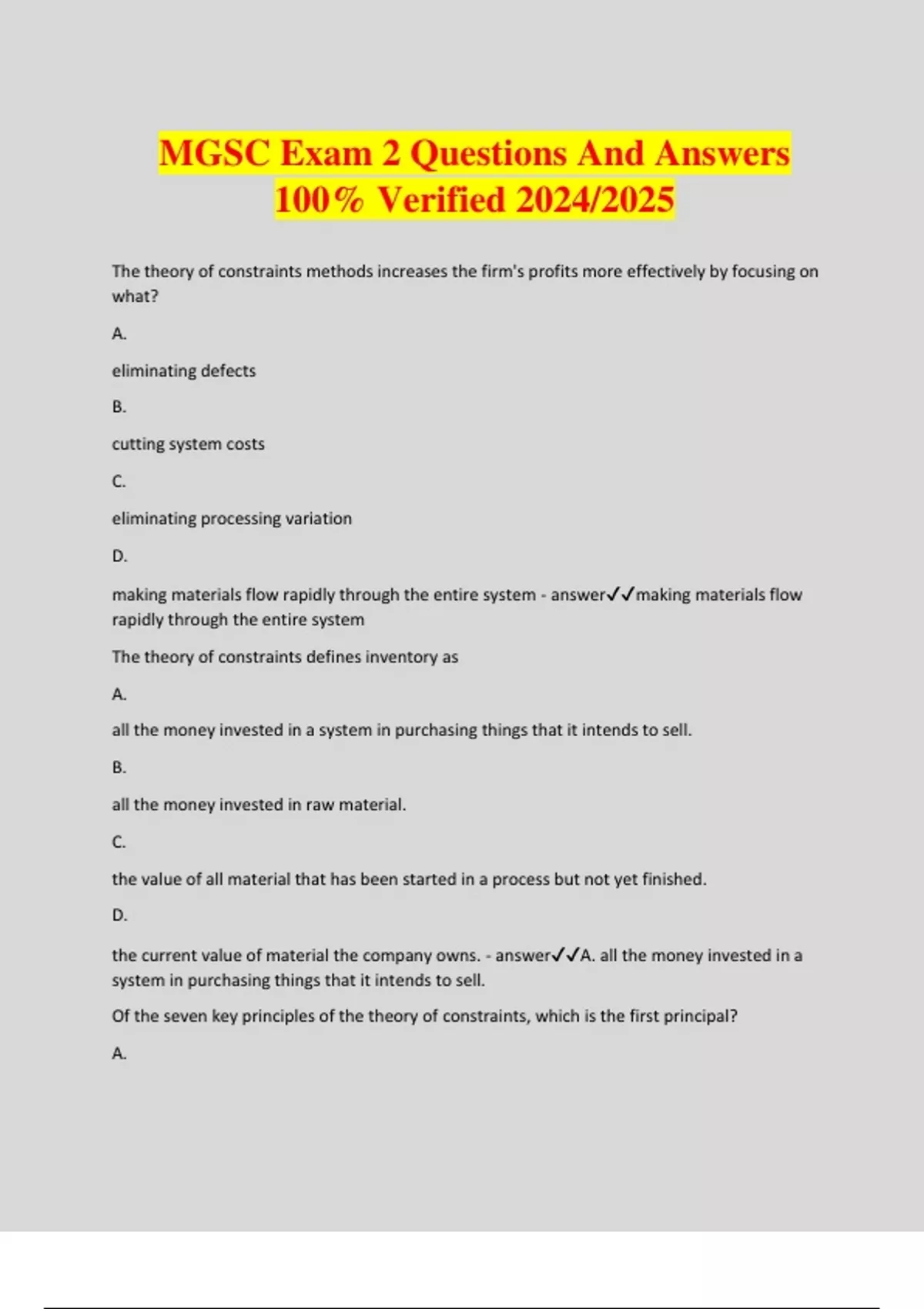 MGSC Exam 2 Questions And Answers 100% Verified 2024/2025 The theory of constraints methods increases the firm's profits more effectively by focusing on what? A. eliminating defects B. cutting system costs C. eliminating processing variation D. making materials flow rapidly through the entire system - answermaking materials flow rapidly through the entire system The theory of constraints defines inventory as A. all the money invested in a system in purchasing things that it intends to sell. B. all the money invested in raw material. C. the value of all material that has been started in a process but not yet finished. D. the current value of material the company owns. - answerA. all the money invested in a system in purchasing things that it intends to sell. Of the seven key principles of the theory of constraints, which is the first principal? A. maximizing the output and efficiency of every resource is required to maximize the throughput of the entire system B. the focus should be on balancing flow, not on balancing capacity C. every capital investment must be viewed from the perspective of its global impact product margin D. the focus should be on balancing capacity, not on balancing flow - answerB. the focus should be on balancing flow, not on balancing capacity An item that has been built to stock has yet to be sold. Which TOC operational measure is used to describe it in its current state? A. Utilization B. Throughput C. Operational expense D. Inventory - answerd. inventory If during week 1 the mix of work makes operation 1 a bottleneck, and the next week it may makes operation 3 the bottleneck, the variability in workload has created a A. marginal bottleneck. B. floating bottleneck. C. no bottleneck. D. activated bottleneck. - answerB. floating bottleneck. A workstation in a process is a bottleneck if A. it processes the smallest total workload. B. it has the smallest average capacity. C. it has the lowest average utilization. D. it has the highest total time per unit processed. - answerd. it has the highest total time per unit processed. The theory of constraints (TOC) - answersystematic management approach that focuses on actively managing those constraints that impede a firm's progress toward its goal of maximizing profits and effectively using its resources. in TOC All the money invested in a system in purchasing things that it intends to sell - answerinventory in toc Rate at which a system generates money through sales - answerThroughput (T) All the money a system spends to turn inventory into throughput - answerOperating Expense (OE) The degree to which equipment, space, or workforce is currently being used; it is measured as the ratio of average output rate to maximum capacity, expressed as a percentage - answerUtilization (U) It is always best to manage the system so that utilization at the bottleneck resource is ------- to maximize throughput. - answermaximized The focus should be on balancing ----, not on balancing capacity - answerflow An hour lost at a ------- or a constrained resource is an hour lost for the whole system. In contrast, an hour saved at a non-bottleneck resource is a mirage, because it does not make the whole system more productive. - answerbottlenec