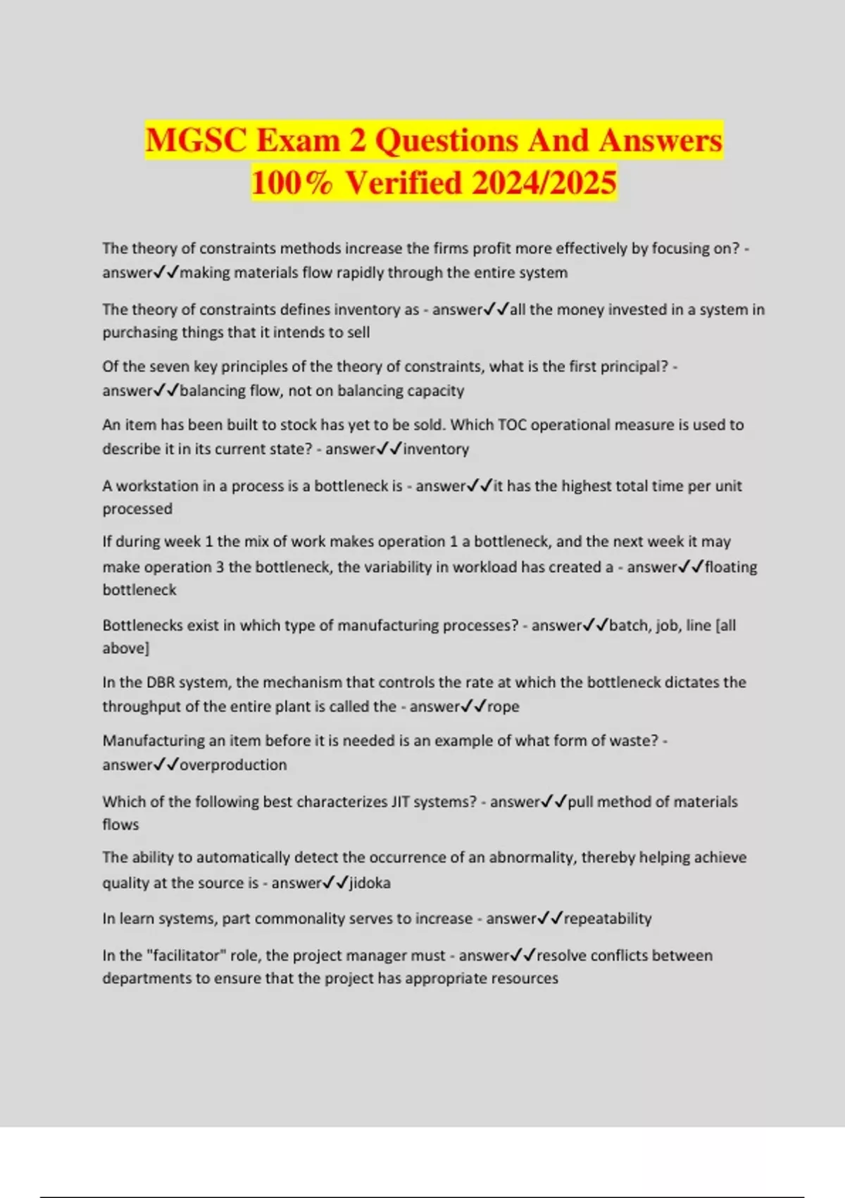 MGSC Exam 2 Questions And Answers 100% Verified 2024/2025 The theory of constraints methods increase the firms profit more effectively by focusing on? - answermaking materials flow rapidly through the entire system The theory of constraints defines inventory as - answerall the money invested in a system in purchasing things that it intends to sell Of the seven key principles of the theory of constraints, what is the first principal? - answerbalancing flow, not on balancing capacity An item has been built to stock has yet to be sold. Which TOC operational measure is used to describe it in its current state? - answerinventory A workstation in a process is a bottleneck is - answerit has the highest total time per unit processed If during week 1 the mix of work makes operation 1 a bottleneck, and the next week it may make operation 3 the bottleneck, the variability in workload has created a - answerfloating bottleneck