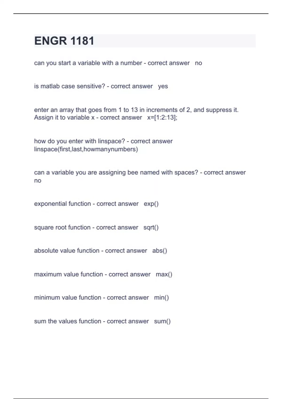 ENGR 1181 Questions with complete solution 2024/2025can you start a variable with a number - correct answer no is matlab case sensitive? - correct answer yes enter an array that goes from 1 to 13 in increments of 2, and suppress it. Assign it to variable x - correct answer x=[1:2:13]; how do you enter with linspace? - correct answer linspace(first,last,howmanynumbers) can a variable you are assigning bee named with spaces? - correct answer no exponential function - correct answer exp() square root function - correct answer sqrt() absolute value function - correct answer abs() maximum value function - correct answer max() minimum value function - correct answer min() sum the values fu