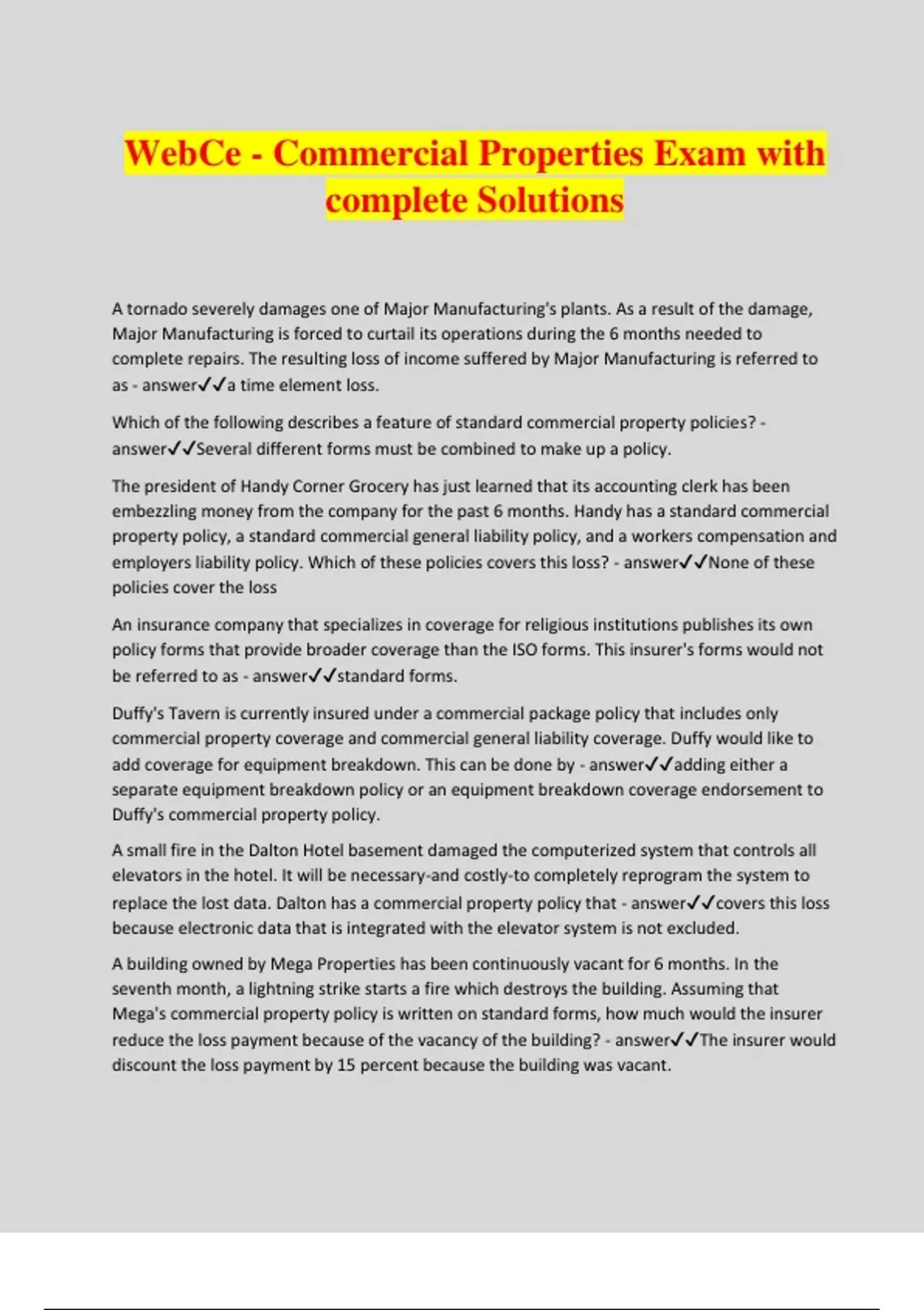 WebCe - Commercial Properties Exam with complete Solutions A tornado severely damages one of Major Manufacturing's plants. As a result of the damage, Major Manufacturing is forced to curtail its operations during the 6 months needed to complete repairs. The resulting loss of income suffered by Major Manufacturing is referred to as - answera time element loss. Which of the following describes a feature of standard commercial property policies? - answerSeveral different forms must be combined to make up a policy. The president of Handy Corner Grocery has just learned that its accounting clerk has been embezzling money from the company for the past 6 months. Handy has a standard commercial property policy, a standard commercial general liability policy, and a workers compensation and employers liability policy. Which of these policies covers this loss? - answerNone of these policies cover the loss An insurance company that specializes in coverage for religious institutions publishes its own policy forms that provide broader coverage than the ISO forms. This insurer's forms would not be referred to as - answerstandard forms. Duffy's Tavern is currently insured under a commercial package policy that includes only commercial property coverage and commercial general liability coverage. Duffy would like to add coverage for equipment breakdown. This can be done by - answeradding either a separate equipment breakdown policy or an equipment breakdown coverage endorsement to Duffy's commercial property policy. A small fire in the Dalton Hotel basement damaged the computerized system that controls all elevators in the hotel. It will be necessary-and costly-to completely reprogram the system to replace the lost data. Dalton has a commercial property policy that - answercovers this loss because electronic data that is integrated with the elevator system is not excluded. A building owned by Mega Properties has been continuously vacant for 6 months. In the seventh month, a lightning strike starts a fire which destroys the building. Assuming that Mega's commercial property policy is written on standard forms, how much would the insurer reduce the loss payment because of the vacancy of the building? - answerThe insurer would discount the loss payment by 15 percent because the building was vacant. Ad Men Advertising Agency is located on the 25th floor of a high-rise building, and the declarations of its commercial property policy list its location as "Suite 2500, 1271 Madison Avenue, New York, NY." Ad Men's valuable laser printer is stolen from the building's outdoor ground-floor loading dock when an employee leaves it unattended while fetching his car. Ad Men's policy includes the special causes of loss form. Ad Men's insurance - answercovers this loss because the property was within 100 feet of the building. Executive Dry Cleaning wants to have coverage for personal property of its customers in its commercial property policy. What must be done to activate this coverage under the standard building and personal property coverage form? - answerA limit of insurance for personal property of others must be shown on the policy declarations page. Handy's Corner Grocery has a standard commercial property policy covering its retail store. An explosion destroys $15,000 of grocery inventory and $5,000 in cash. Is the loss of the cash covered under Handy's commercial property policy? - answerNo, because money and securities are excluded from coverage. What coverage is provided under the building and personal property coverage form for the cost of replacing or restoring lost information on valuable papers and records? - answerValuable papers and records are covered for up to $2,500 (or a higher limit, if shown in the declarations) for loss from certain perils. The roof of the Green Building is partially covered with live grass. Green's building and personal property coverage form covers these plants, because this living roof is what the form refers to as a(n) - answervegetated roof. After high winds severely damage the roof of its building, Keepsake Fine Art and Collectibles moves its inventory to a temporary location to protect it from damage from the elements. Unfortunately, the temporary location suffers a flood only 3 days after the move, and Keepsake's inventory is damaged. Assuming that Keepsake has an unendorsed standard commercial property, does the policy provide coverage for this loss? - answerYes. The preservation of property additional coverage covers loss to property that has been moved from a covered location to protect it from damage by a covered cause of loss. The crew demolishing a taller building next to the SA Store accidentally knocked over a masonry wall that toppled onto the roof of the SA Store. This, in turn, caused the SA Store roof to collapse, damaging the SA Store building and its contents and injuring patrons inside the store. A substantial amount of debris must be removed before repairs to the SA Store building can begin. Subject to dollar limitations, SA Store's building and personal property coverage policy (2012 edition), which covers broad form causes of loss, will cover - answerremoving debris of the store building and contents and debris of the