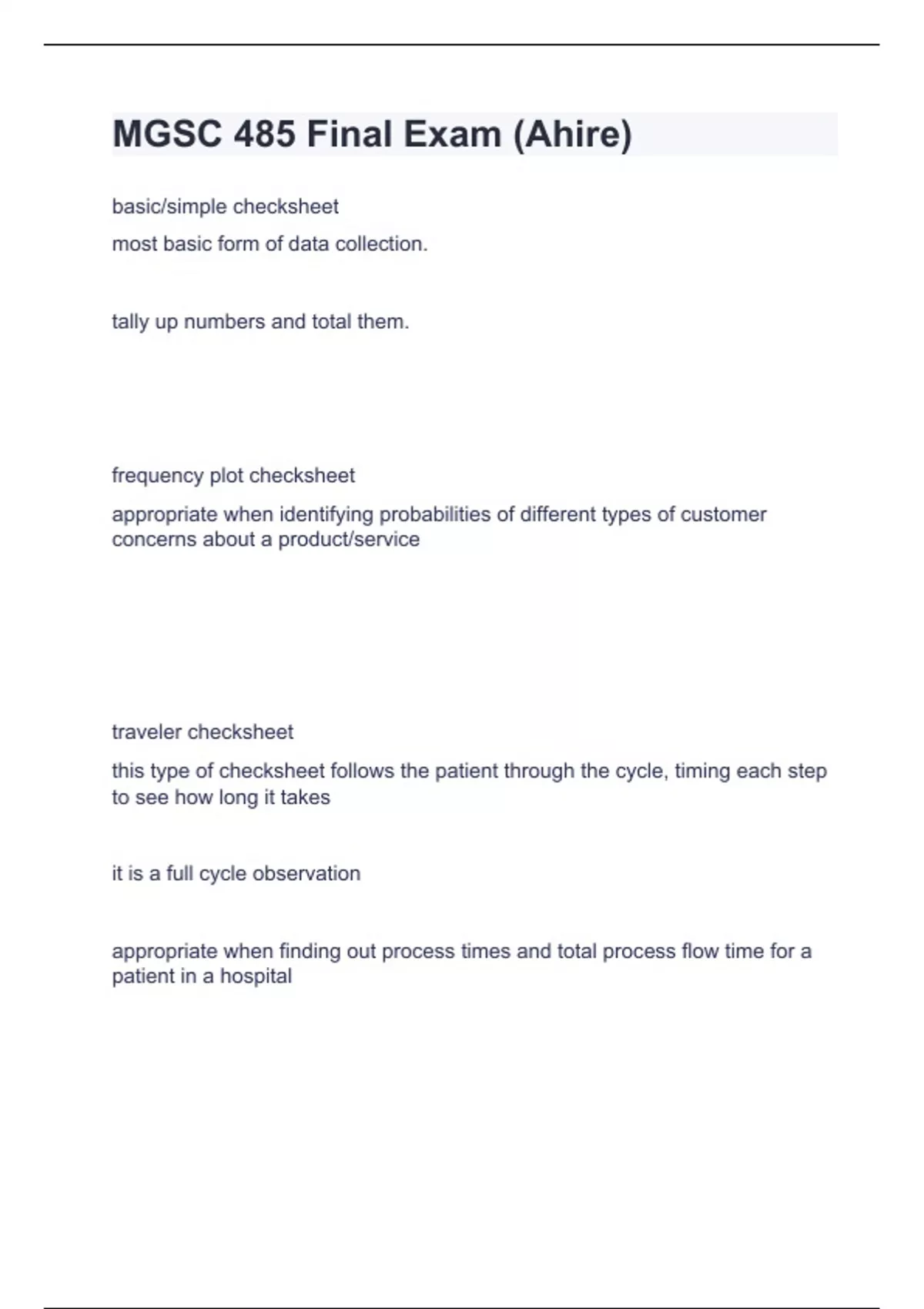 MGSC 485 Final Exam Question and answers correctly solved 2024/2025basic/simple checksheet most basic form of data collection. tally up numbers and total them. frequency plot checksheet appropriate when identifying probabilities of different types of customer concerns about a product/service traveler checksheet this type of checksheet follows the patient through the cycle, timing each step to see how long it takes it is a full cycle observation appropriate when finding out process times and total process flow time for a patient in a hospital location checksheet