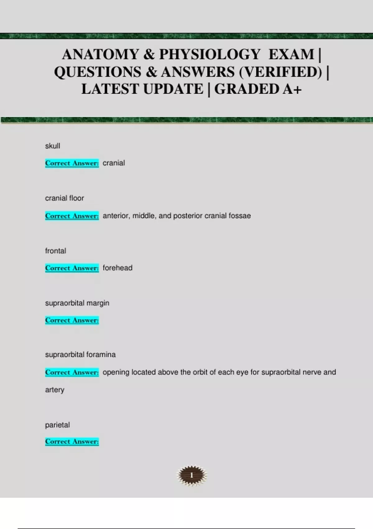 1 ANATOMY & PHYSIOLOGY EXAM | QUESTIONS & ANSWERS (VERIFIED) | LATEST UPDATE | GRADED A+ skull Correct Answer: cranial cranial floor Correct Answer: anterior, middle, and posterior cranial fossae frontal Correct Answer: forehead supraorbital margin Correct Answer: supraorbital foramina Correct Answer: opening located above the orbit of each eye for supraorbital nerve and artery parietal Correct Answer: 2 occipital Correct Answer: foramen magnum Correct Answer: occipital condyles Correct Answer: external occipital protuberance Correct Answer: superior and inferior nuchal lines Correct Answer: temporal Correct Answer: styloid process Correct Answer: mastoid process Correct Answer: 3 jugular foramen Correct Answer: carotid foramen Correct Answer: external auditory meatus Correct Answer: sphenoid bone Correct Answer: sphenoid body Correct Answer: sphenoid greater wing Correct Answer: sphenoid lesser wing Correct Answer: stella turcica Correct Answer: 4 hypophyseal fossa Correct Answer: optic foramen Correct Answer: superior orbital fissure Correct Answer: inferior orbital fissure Correct Answer: ethmoid bone Correct Answer: crista galli Correct Answer: cribriform plate Correct Answer: mandible Correct Answer: 5 rami of mandible Correct Answer: mandibular condyle Correct Answer: coronoid process of mandible Correct Answer: mental foramen Correct Answer: maxillae Correct Answer: anterior nasal spine Correct Answer: hard palate Correct Answer: lacrimals Correct Answer: 6 palatines Correct Answer: nasal bones Correct Answer: vomer Correct Answer: saggital suture Correct Answer: coronal suture Correct Answer: lambdoidal suture Correct Answer: Squamousal suture Correct Answer: vertebrae body Correct Answer: 7 vertebral spinous process Correct Answer: vertebral pedicle Correct Answer: vertebral lamina Correct Answer: vertebral arch Correct Answer: vertebral foramen Correct Answer: intervertebral foramina Correct Answer: vertebral transverse process Correct Answer: superior articular process Correct Answer: 8 inferior articular process Correct Answer: sacrum Correct Answer: articular surface for the ileum of coxal Correct Answer: Find a pic sacrum ala Correct Answer: posterior sacral crest Correct Answer: anterior/posterior sacral foramina Correct Answer: promontory of sacrum Correct Answer: sacral canal Correct Answer: 9 coccyx Correct Answer: thorax Correct Answer: sternum Correct Answer: manubrium Correct Answer: sternal angle Correct Answer: sternum body Correct Answer: xiphoid process Correct Answer: ribs Correct Answer: 10 True ribs (1-7) Correct Answer: attach directly to sternum false ribs (8-12) Correct Answer: ribs that do not have a direct attachment to the sternum floating ribs (11-12) Correct Answer: not attached to sternum (only vertebrae) costal cartilage Correct Answer: sternal end of clavicle Correct Answer: acromial end of clavicle Correct Answer: glenoid fossa Correct Answer: scapula spine 11 Correct Answer: acromion process Correct Answer: coracoid process Correct Answer: greater and lesser tubercles Correct Answer: intertubercular groove Correct Answer: trochlea of humerus Correct Answer: capitulum of humerus Correct Answer: medial epicondyle of humerus Correct Answer: lateral epicondyle of humerus 12 Correct Answer: Olecranon fossa of humerus Correct Answer: Coronoid fossa of humerus Correct Answer: Ulna Correct Answer: semilunar notch of ulna Correct Answer: oleocranon process Correct Answer: radial notch Correct Answer: styloid process of ulna Correct Answer: radius 13 Correct Answer: radial tuberosity Correct Answer: styloid process of radius Correct Answer: Carpals Correct Answer: Metacarpals Correct Answer: Phalanges Correct Answer: pelvis Correct Answer: Acetabulum Correct Answer: ilum 14 Correct Answer: greater sciatic notch Correct Answer: iliac fossa Correct Answer: ishium Correct Answer: obturator foramen Correct Answer: ischial spine Correct Answer: ischial tuberosity Correct Answer: Pubis bone Correct Answer: pubic symphysis 15 Correct Answer: Femur Correct Answer: greater and lesser trochanters Correct Answer: lateral condyles Correct Answer: medial condyle Correct Answer: lateral epicondyle of femur Correct Answer: medial epicondyle of femur Correct Answer: Patella Correct Answer: tibia 16 Correct Answer: medial condyle of tibia Correct Answer: lateral condyle of tibia Correct Answer: medial malleolus Correct Answer: tibial tuberosity Correct Answer: fibula Correct Answer: lateral malleolus Correct Answer: tarsals Correct Answer: Metatarsals 17 Correct Answer: Phalanges Correct Answer: