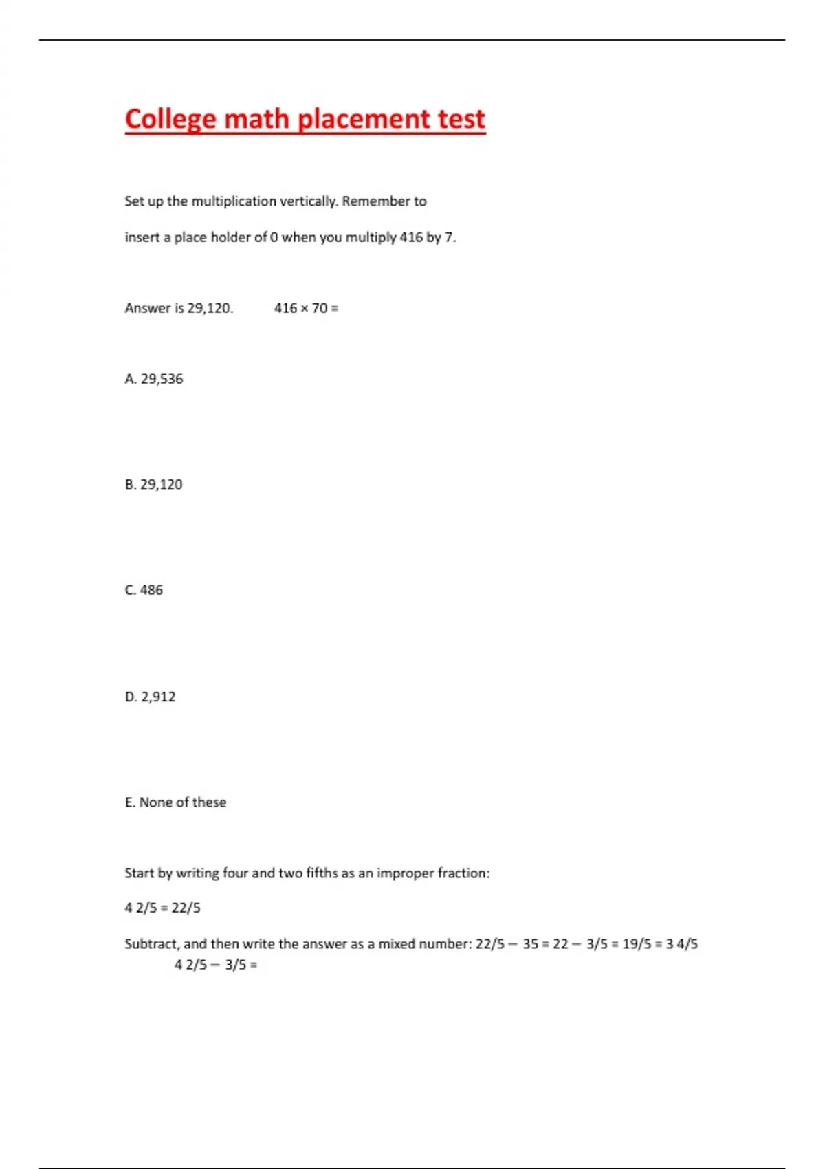 Set up the multiplication vertically. Remember to insert a place holder of 0 when you multiply 416 by 7. Answer is 29,120. 416 × 70 = A. 29,536 B. 29,120 C. 486 D. 2,912 E. None of these Start by writing four and two fifths as an improper fraction: 4 2/5 = 22/5 Subtract, and then write the answer as a mixed number: 22/5 − 35 = 22 − 3/5 = 19/5 = 3 4/5 4 2/5 − 3/5 = A. 3 4/5 B. 1 1/5 C. 3 1/5 D. 2 1/5 E. None of these The denominator of each fraction is 5. Since the denominators are the same, just subtract the numerators: 4/5 − 1/5 = 4 − 1 /5 = 3/5 4/5 −