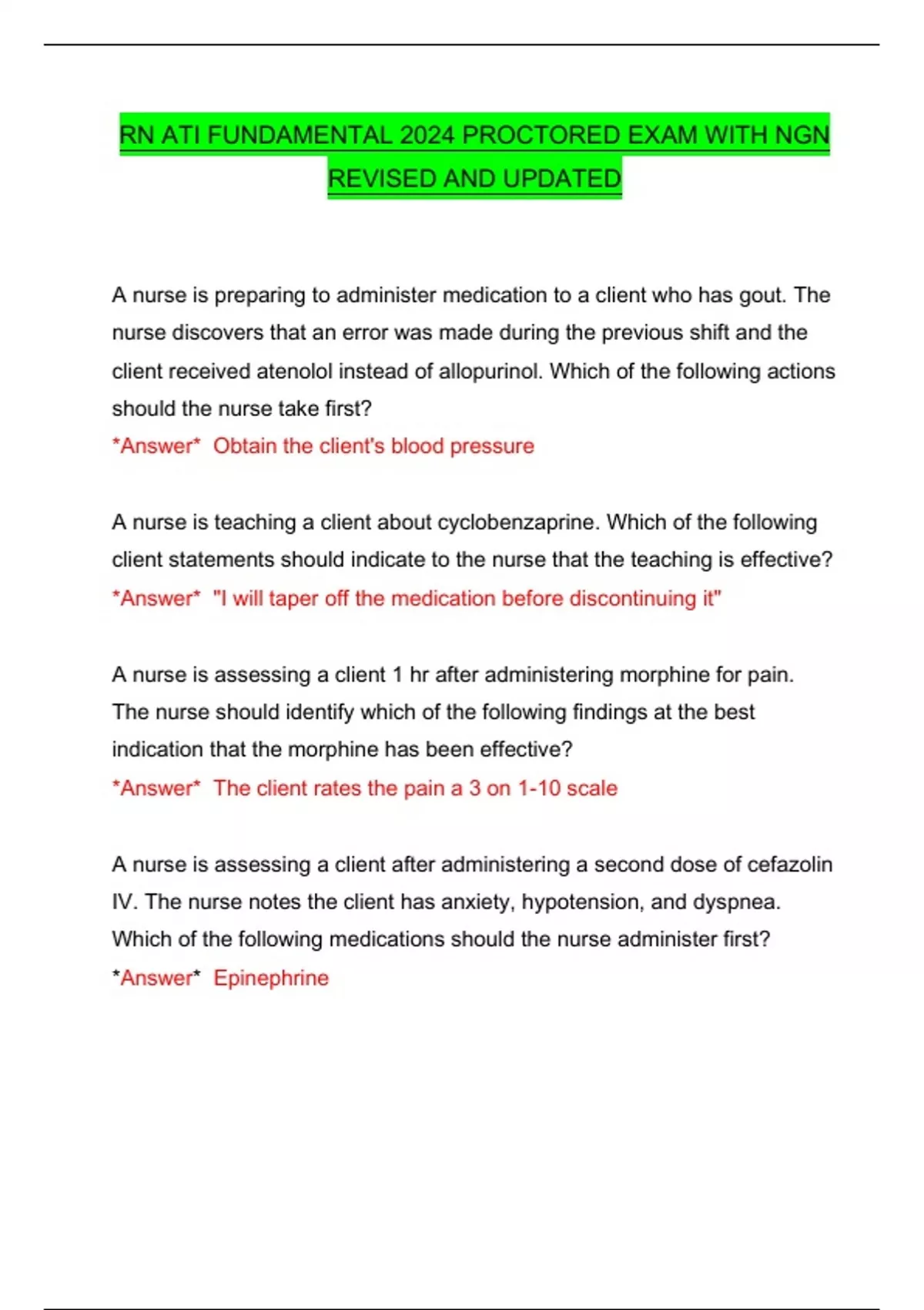 RN ATI FUNDAMENTAL 2024 PROCTORED EXAM WITH NGN REVISED AND UPDATED A nurse is preparing to administer medication to a client who has gout. The nurse discovers that an error was made during the previous shift and the client received atenolol instead of allopurinol. Which of the following actions should the nurse take first? *Answer* Obtain the client's blood pressure A nurse is teaching a client about cyclobenzaprine. Which of the following client statements should indicate to the nurse that the teaching is effective? *Answer* "I will taper off the medication before discontinuing it" A nurse is assessing a client 1 hr after administering morphine for pain. The nurse should identify which of the following findings at the best indication that the morphine has been effective? *Answer* The client rates the pain a 3 on 1-10 scale A nurse is assessing a client after administering a second dose of cefazolin IV. The nurse notes the client has anxiety, hypotension, and dyspnea. Which of the following medications should the nurse administer first? *Answer* Epinephrine A nurse is providing teaching to a client who is to begin taking oxybutynin for urinary incontinence. Which of the following adverse effects should the nurse include in teaching (select all) *Answer* dry mouth, blurred vision, dry eyes A nurse is preparing to administer PO sodium polystyrene sulfonate to a client who has hyperkalemia. Which of the following actions should the nurse plan to take? *Answer* Monitor the client for constipation A nurse is preparing to administer heparin subcutaneously to a client. Which of the following actions should the nurse plan to take? *Answer* administer the medication 5cm (2in) radius of the umbilicus A nurse is teaching a client who is to begin taking tamoxifen for the treatment of breast cancer. Which of the following adverse effects should the nurse include in the teaching? *Answer* hot flashes Lab results for digoxin for HF. What results should nurses report to providers? *Answer* potassium level of 2.8 mEq/L Teaching about peptic ulcer disease, new prescription of sucralfate. What action should nurse include in the teaching? *Answer* forms a protective barrier over ulcers A nurse is assessing a client who has myasthenia gravis and is taking neostigmine. Which of the following findings should indicate to the nurse that the patient is experiencing an adverse effect? *Answer* Miosis Nurse on the acute care unit is caring for a client who is receiving gentamicin IV. The nurse should report which finding as an adverse effect? *Answer* Tinnitus What info should a nurse include when teaching about medication reconciliation? *Answer* A transition in care requires the nurse to conduct medication reconciliation A nurse is caring for someone with acute alcohol withdrawal. Which client outcome should the nurse administer chlordiazepoxide? *Answer* prevent delirium tremens Lab results for deep vein thrombosis, client is receiving heparin via IV. *Answer* platelets 96,000/mm^3 Nurse administers a dose of metformin instead of metoclopramide. What should she do first? *Answer* check client's blood glucose