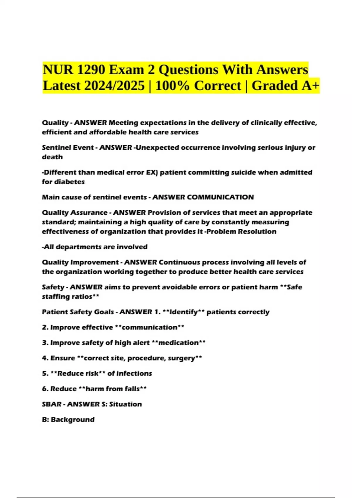 NUR 1290 Exam Questions With Answers Latest 2024/2025 | 100% Correct (Graded A+) Quality - ANSWER Meeting expectations in the delivery of clinically effective, efficient and affordable health care services Sentinel Event - ANSWER -Unexpected occurrence involving serious injury or death -Different than medical error EX) patient committing suicide when admitted for diabetes Main cause of sentinel events - ANSWER COMMUNICATION Quality Assurance - ANSWER Provision of services that meet an appropriate standard; maintaining a high quality of care by constantly measuring effectiveness of organization that provides it -Problem Resolution -All departments are involved Quality Improvement - ANSWER Continuous process involving all levels of the organization working together to produce better health care services Safety - ANSWER aims to prevent avoidable errors or patient harm **Safe staffing ratios** Patient Safety Goals - ANSWER 1. **Identify** patients correctly 2. Improve effective **communication** 3. Improve safety of high alert **medication** 4. Ensure **correct site, procedure, surgery** 5. **Reduce risk** of infections 6. Reduce **harm from falls** SBAR - ANSWER S: Situation B: Background NUR 1290 Exam 2 Questions With Answers Latest 2024/2025 | 100% Correct | Graded A+ A: Assessment R: Recommendation Five Rights of Medication Safety - ANSWER right drug right route right time/freq right patient right dose Care Models - ANSWER innovative approaches to provide care to different patient populations Dedicated Unit Approach - ANSWER Special attention to: -physical environment -interdisciplinary collaboration -nurse initiated clinical protocols of care -activity rooms Syndrome Specific Model - ANSWER -Identify a specific clinical syndrome that's common to their patient population -Develop clinical & educational tools to detect & manage the disease -Improves comprehensive care delivery Quality Cost Model of Transitional Care - ANSWER -Nurse Specialist with advanced knowledge and skills follows a patient throughout the hospital stay and continuing after discharge. -Assesses patients upon hospital admission and every 48 hours and then when home. Purpose of QSEN - ANSWER Prepare nurses with the competencies necessary to continuously improve the quality and safety of the health care systems in which they work. -Each competency includes **Knowledge, Skill and Attitude (KSA)** Competencies - ANSWER 1. Patient/Family Centered Care 2. Teamwork and collaboration 3. Safety 4. Evidence Based Practice 5. Quality Improvement 6. Informatics Patient/Family Centered Care - ANSWER Recognize the patient as the source of control and full partner in providing compassionate and coordinated care based on respect for patient preferences, values, and needs The patient and family are in a.. - ANSWER partnered relationship with their healthcare providers Collaboration and Teamwork - ANSWER Function effectively within nursing and interprofessional teams What does collaboration involve - ANSWER open communication mutual respect shared decision making Evidence Based Practice - ANSWER integration of the best available research with clinical expertise in the context of client characteristics, culture, and preferences Quality Improvement - ANSWER Use data to monitor the outcomes of care processes and use improvement methods to design and test changes to continuously improve the quality and safety of health care systems. What does improving patient care require - ANSWER systematic process of defining problems in order to identify potential causes and develop strategies to improve care Safety - ANSWER Minimize risk of harm to patients and providers through both system effectiveness and individual performance Informatics - ANSWER use information and technology to communicate, manage knowledge, mitigate error, and support decision making Why do we study informatics - ANSWER Things are constantly changing -Technology facilitates the creative process in nurses High Tech - High Touch - ANSWER Nurses need to be comfortable working with computers and advance technology while providing care for their clients **healthcare is dependent on information--> no excuse for not knowing proper medications/doses** Nursing Informatics Model - ANSWER -Cognitive Science -Information Science -Computer Science When are computers used in nursing education? - ANSWER -Assist education PDA LCD Smartphones NCLEX Function of computers in nursing practice - ANSWER record information, provide access to other departments, manage schedules -Documentation of clients status and medical records **HIPPAA** Telehealth - ANSWER Technology to asses, diagnose and treat at a distance -Changes the way we document Devices used in Telehealth - ANSWER BP, glucometers, peak flow, pulse oximeters, video monitors Biometric Technology - ANSWER Use human characteristics (e.g., fingerprints, retinas, irises, voices, facial patterns) to authenticate or grant access to data or information Bedside Data Entry - ANSWER Records clients assessments, medication administration, progress notes, care plan updating, client acuity and accrued changes **People at home can access whats going on at the hospital Computer Based Client Record - ANSWER Provides easy retrieval of data -Tells about conflicting Meds Tech Breakthroughs that improve nursing - ANSWER -Better communication Systems -Electronic Healthcare Records -Real Time locating systems -Better diagnostic tools -Tech driven drug delivery -Patient Lifting Technology Block Chain Systems - ANSWER Storing digital information Artificial Inteligence - ANSWER Enhances treatments, helps diagnose patients, doctor DOES NOT have to be present Value Based Healthcare - ANSWER Paying physicians based on the quality of care they provide instead of hours worked or number of patients they see Information Literacy - ANSWER Ability to determine when information is needed and how you can LOCATE, EVALUATE, AND USE the information Information Technology - ANSWER