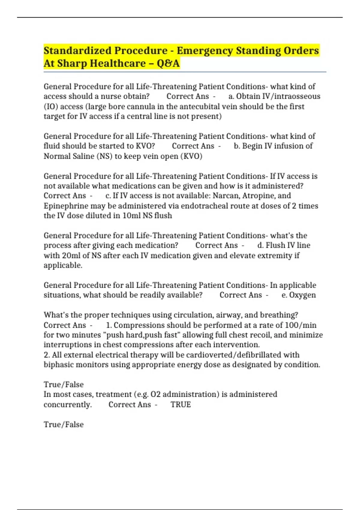 Standardized Procedure - Emergency Standing Orders At Sharp Healthcare – Q&A