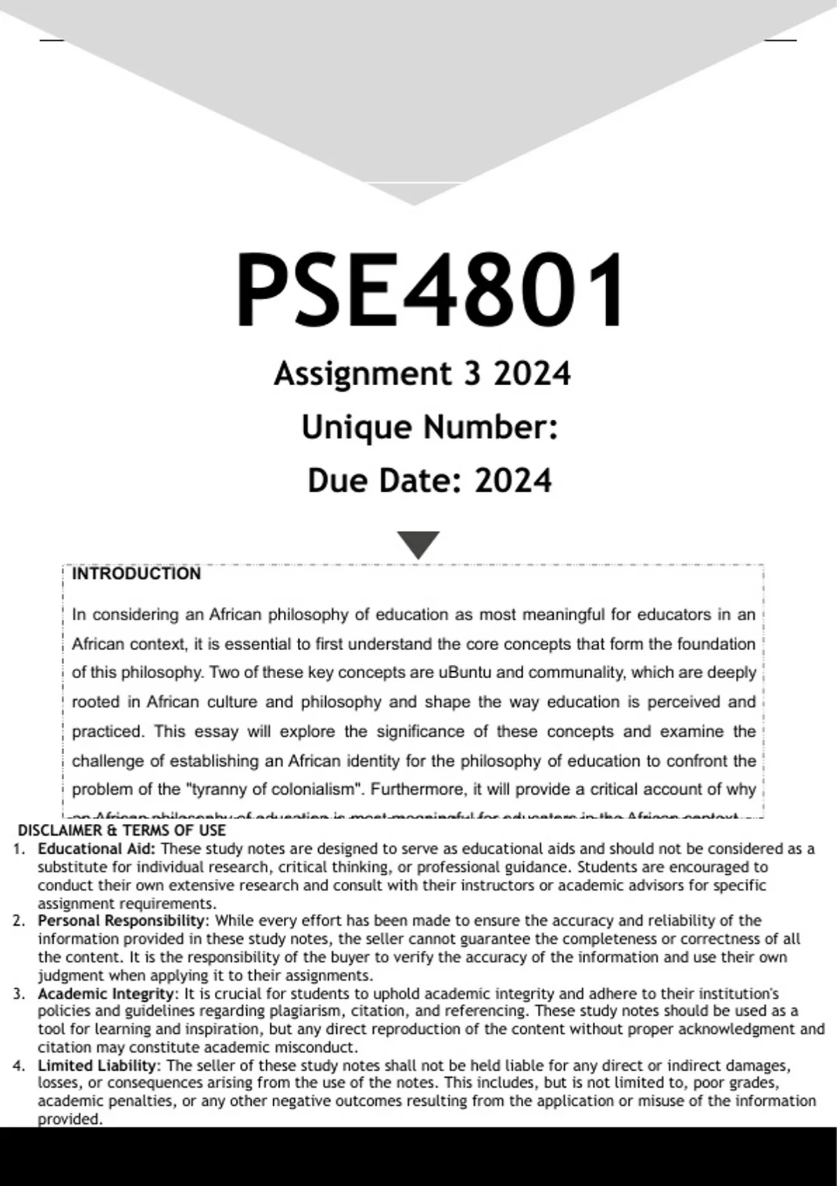 Well-structured PSE4801 Assignment 3 (ANSWERS) 2024 - DISTINCTION GUARANTEED. (DETAILED ANSWERS - DISTINCTION GUARANTEED!). .... Write an essay in not more than ten typed pages on why I consider an African philosophy of education to be most meaningful for an educator involved in teaching and learning in an African context. Structure your essay as follows: 1. Introduction to the essay in which you give your philosophical understanding of the following concept: 1.1 uBuntu” (5) 1.2 Communality (5) 1.3 Examine the challenge of establishing an African identity for philosophy of education to confront the problem of the “tyranny of colonialism”. (10) 1.4. Provide a critical account on why you consider an African philosophy of education to be most meaningful for an educator involved in teaching and learning in an African context. (15) 30 2. Body of the essay in which you should deal with the following: 2.1 A (post)Critical African philosophy of education (25) 2.2 Implications of an African philosophy of education for teaching and learning (25) 3. Conclusion to the essay in which you provide a strong justification why you consider an African philosophy of education to be most meaningful for an educator involved in teaching and learning in an African context. (No new information please) (10) 4. References You need to list the cited references alphabetically according to the Harvard Method of Reference. (5)