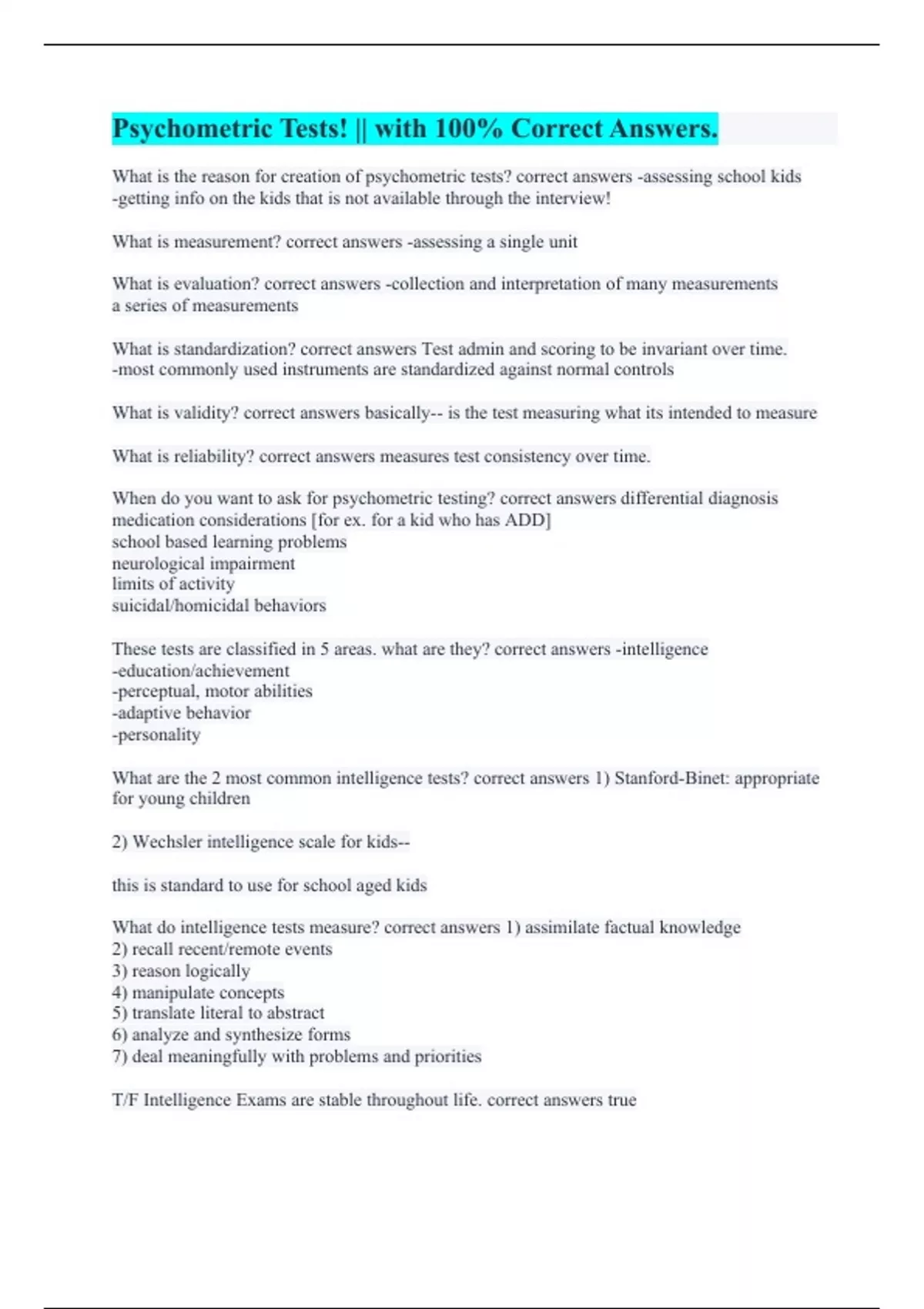 What is the reason for creation of psychometric tests? correct answers -assessing school kids -getting info on the kids that is not available through the interview! What is measurement? correct answers -assessing a single unit What is evaluation? correct answers -collection and interpretation of many measurements a series of measurements What is standardization? correct answers Test admin and scoring to be invariant over time. -most commonly used instruments are standardized against normal controls What is validity? correct answers basically-- is the test measuring what its intended to measure What is reliability? correct answers measures test consistency over time. When do you want to ask for psychometric testing? correct answers differential diagnosis medication considerations [for ex. for a kid who has ADD] school based learning problems neurological impairment limits of activity suicidal/homicidal behaviors These tests are classified in 5 areas. what are they? correct answers -intelligence -education/achievement -perceptual, motor abilities -adaptive behavior -personality What are the 2 most common intelligence tests? correct answers 1) Stanford-Binet: appropriate for young children 2) Wechsler intelligence scale for kids-- this is standard to use for school aged kids What do intelligence tests measure? correct answers 1) assimilate factual knowledge 2) recall recent/remote events 3) reason logically 4) manipulate concepts 5) translate literal to abstract 6) analyze and synthesize forms 7) deal meaningfully with problems and priorities T/F Intelligence Exams are stable throughout life. correct answers true