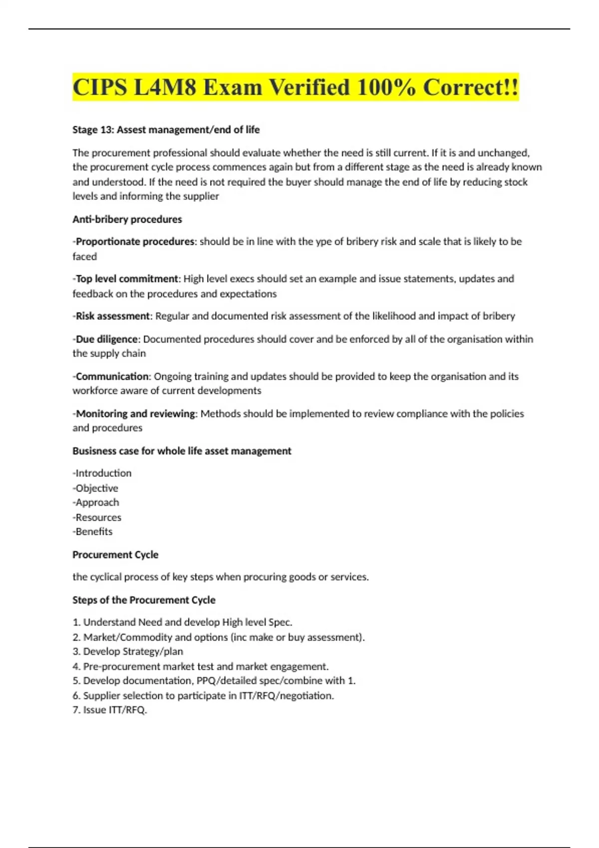 CIPS L4M8 Exam Verified 100% Correct!! Stage 13: Assest management/end of life The procurement professional should evaluate whether the need is still current. If it is and unchanged, the procurement cycle process commences again but from a different stage as the need is already known and understood. If the need is not required the buyer should manage the end of life by reducing stock levels and informing the supplier Anti-bribery procedures -Proportionate procedures: should be in line with the ype of bribery risk and scale that is likely to be faced -Top level commitment: High level execs should set an example and issue statements, updates and feedback on the procedures and expectations -Risk assessment: Regular and documented risk assessment of the likelihood and impact of bribery -Due diligence: Documented procedures should cover and be enforced by all of the organisation within the supply chain -Communication: Ongoing training and updates should be provided to keep the organisation and its workforce aware of current developments -Monitoring and reviewing: Methods should be implemented to review compliance with the policies and procedures Busisness case for whole life asset management -Introduction -Objective -Approach -Resources -Benefits Procurement Cycle the cyclical process of key steps when procuring goods or services. Steps of the Procurement Cycle 1. Understand Need and develop High level Spec. 2. Market/Commodity and options (inc make or buy assessment). 3. Develop Strategy/plan 4. Pre-procurement market test and market engagement. 5. Develop documentation, PPQ/detailed spec/combine with 1. 6. Supplier selection to participate in ITT/RFQ/negotiation. 7. Issue ITT/RFQ. 8. Bid/Tender Evaluation and validation. 9. Contract award and implementation. 10. Warehouse logistics and receipt. 11. Contract performance review and continuous improvement. 12. SRM and SC management and development. 13. Asset management/end of life and lessons learnt. Terms and Conditions and the Developing of Contracts are a very important element of developing contracts, helping to minimise contractual risks and exposure when doing business. Supplier Evaluation the process of evaluating and approving existing and potential suppliers by quantitative assessment against specific business criteria. Sourcing a critical activity that commands increasing attention as managing supply chains becomes more complex (Trautmann et al., 2009). It is used at both tactical and strategic levels and is concerned with what needs to be purchased (product/service), in what quantities, for what purpose and where. Whole life cycle costing takes into account the total cost of a product or service over its lifetime, from concept through to disposal including purchase, hire or lease, maintenance, operation, utilities, training and disposal. It is important for procurement to take all these elements into consideration when making decisions and comparing the costs of buying, renting or leasing equipment particularly. In most cases the purchase costs are only a small proportion of the cost of operating it. Corporate Social Responsibility (CSR) a way of ensuring that the business monitors its compliance with the law and industry standards. It embraces the company's obligations and creates a positive impact through its activities and in some cases relates to a company going beyond its obligations in terms of its effect on the environment and impact on social welfare. Diversity and Inclusion Businesses not only have a responsibility to respect and value all forms of difference including race and ethnicity, culture and belief, gender and sexuality, age and social status and ability. There is also a huge business advantage to be had: diverse teams are more innovative, but also people want to be part of them and stay part of them. Modern Slavery possession or control of a person deprived of their rights with the intention of exploiting them Sustainable and Ethical Procurement consider the impact of environmental, economic and social factors along with price and quality. This is important in terms of how the buyer conducts their relationship with suppliers, including contract negotiation especially when sourcing globally with unfamiliar work cultures. Supplier Diversity A proactive business program which encourages the use of minority-owned, women owned, veteran owned, LGBT-owned [1], service disabled veteran owned, historically underutilized business, and Small Business Administration (SBA)-defined small business concerns as suppliers. Social Value a way of thinking about how scarce resources are allocated and used. It involves looking beyond the price of each individual contract and looking at what the collective benefit to a community is, when a public body chooses to award a contract. implied terms always present in a contract and are set by the law of the land. Express terms are written into the contract. They usually relate to items that can be negotiated and agreed between the parties involved. Examples include payment terms, the specification, delivery details, quantities, and indemnity clauses, etc. Model Form Contracts are a templated contract comprising of standardised and non-negotiated terms and conditions. Can be used to reduce the time required to negotiate specific terms for each agreement. Conditions are fundamentally at the heart of the contract. If they arebreached, they give the injured party the full range of remedies,including the right to terminate. Warranties are minor terms. If there is a breach, the injured party still have the right to claim compensation but might not be able to take any other form of redress. Liquidated Damages are fixed amounts of money agreed between the parties that becomes payable upon a breach of contract. They are enforceable by law. Unliquidated damages are an unspecified amount of money. And are used when the amount of money that will compensate the aggrieved party is unable to be predetermine